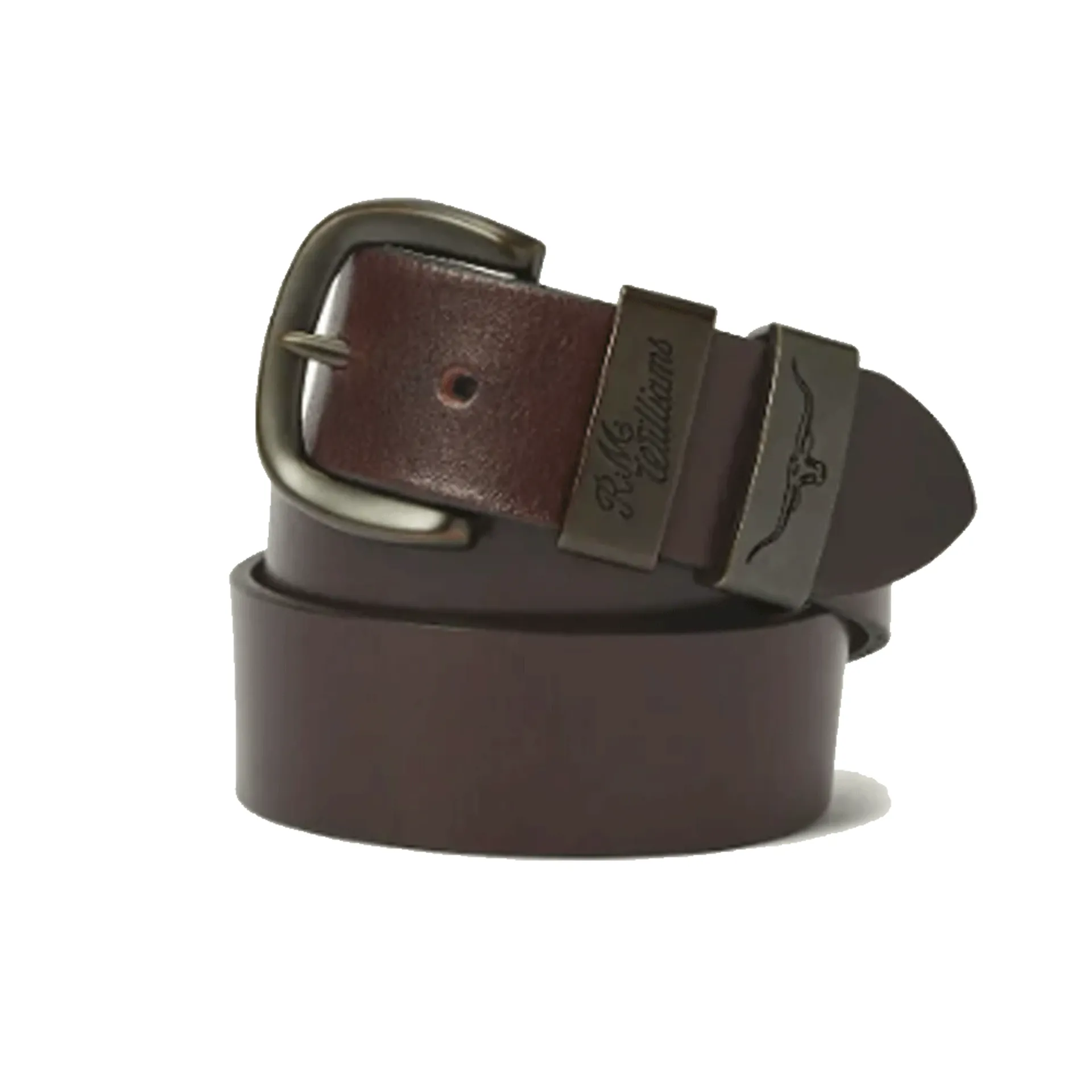 The Drover Belt is an iconic piece from R.M.Williams, crafted in Adelaide using heritage techniques and skills. It's constructed from durable leather in a 1 1/2" strap, with a debossed signature Longhorn decal on the tip and an engraved antique nickel buckle and keeper set.