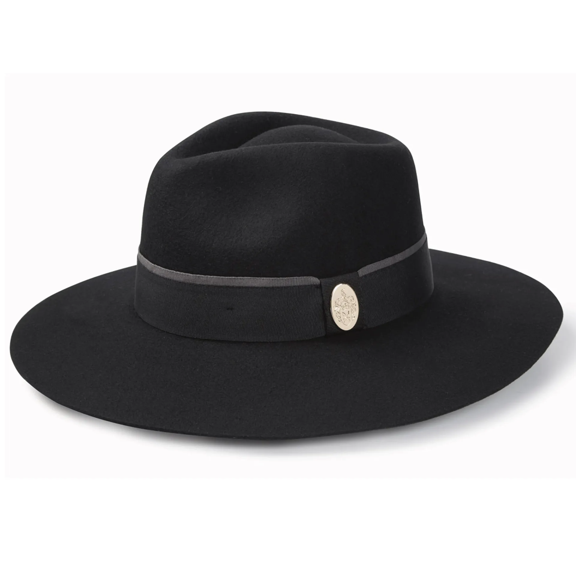A super stylish ladies wide brimmed fedora, perfectly designed for that wow factor. The ribbon band with contrasting edge is finished with a gold crest branding that fits perfectly in place. A versatile hat than can be worn in all seasons, to add glamour to any outfit.