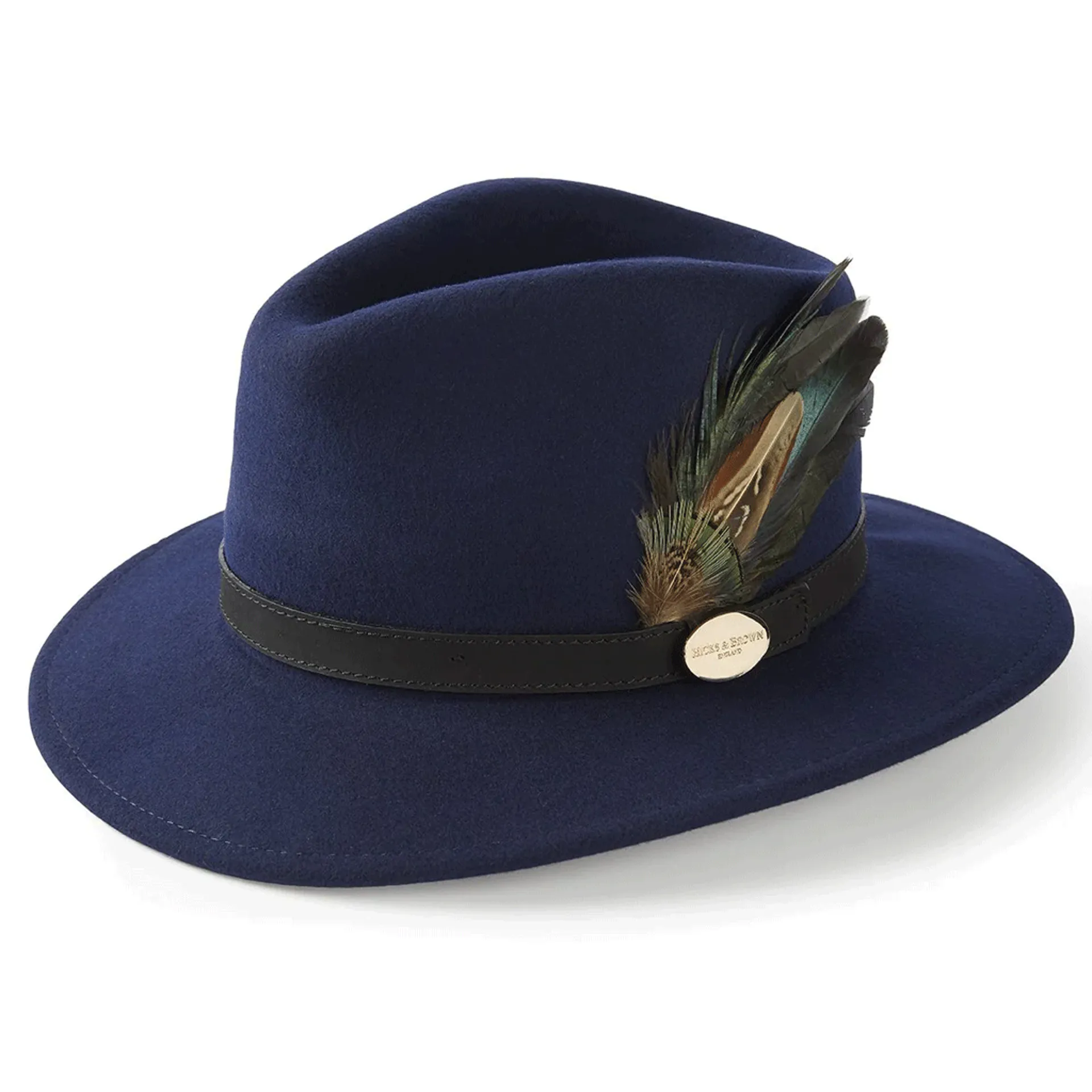 The stunning wool felt Suffolk Fedora is hand finished with a cluster of natural feathers fastened behind a branded leather band.