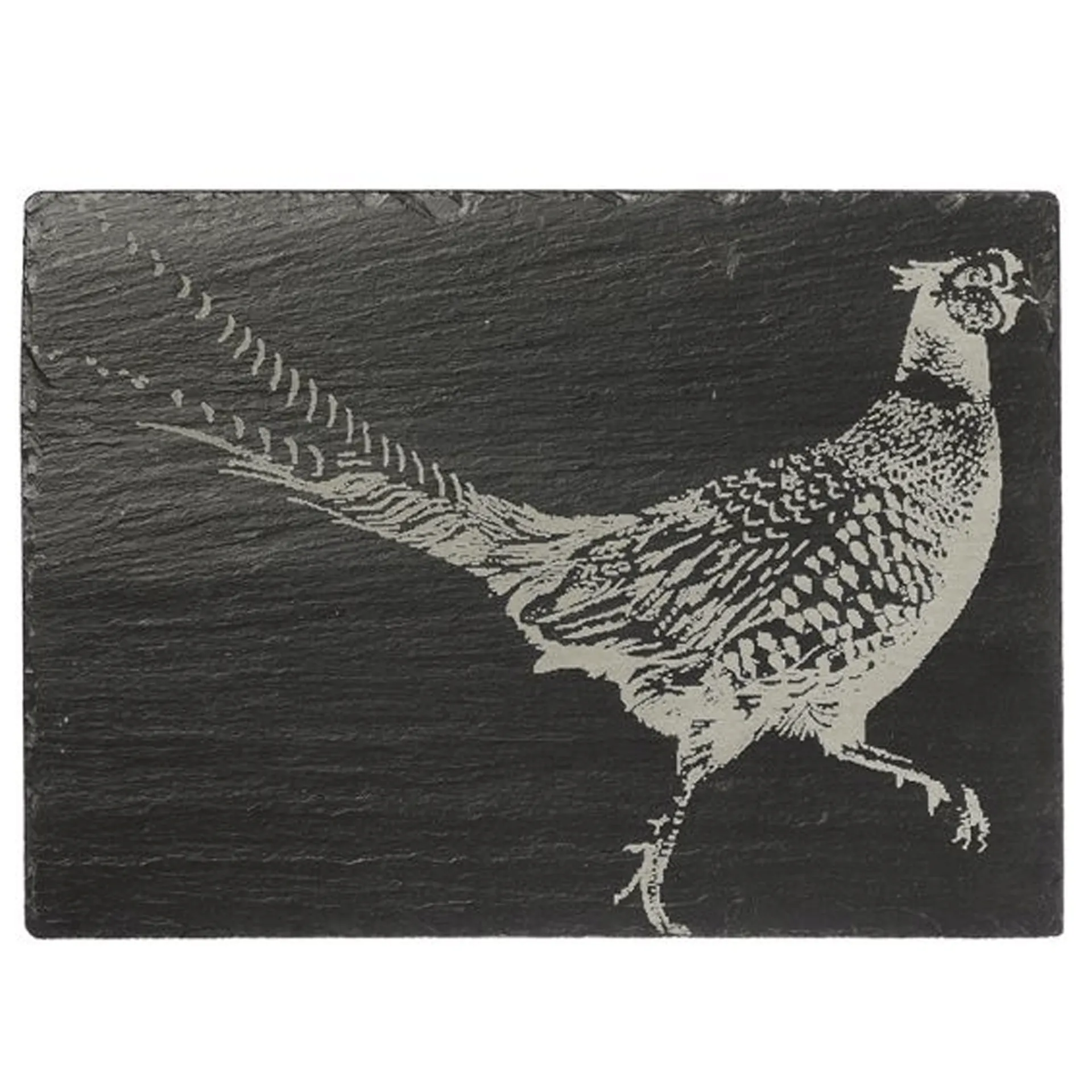 Useful slate cheese board featuring an engraved Pheasant. Measures 35cm x 25cm and is handcrafted in Scotland from slate. Easy to wipe clean and food safe, finished with a foam backing. Ideal gift.