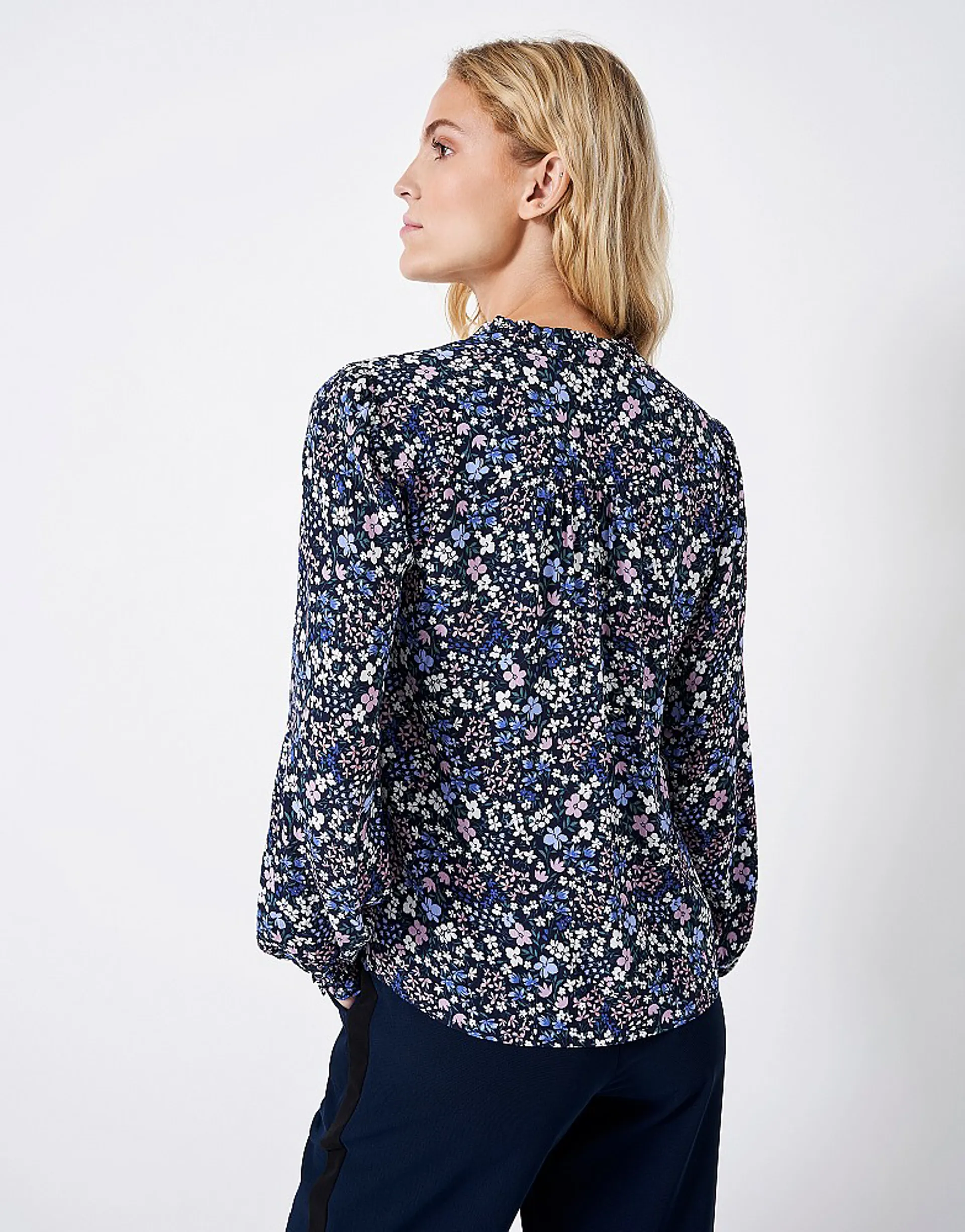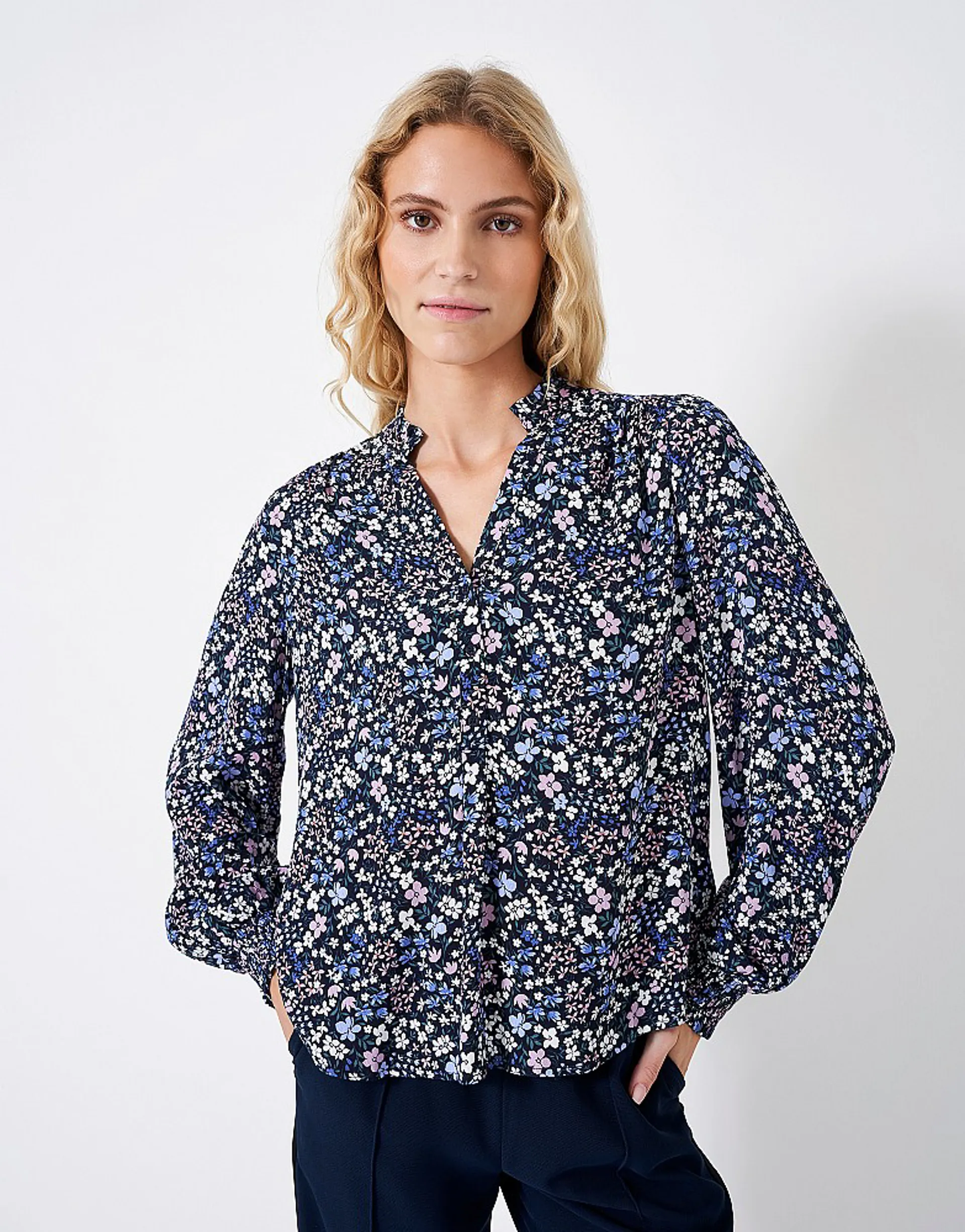 Brighten up your oufit with a pretty floral blouse. Detailed with an all-over blue floral print, this pretty blouse has a open neckline and gently puffed-up sleeves. Add denim or wide leg trousers for effortless elegance.