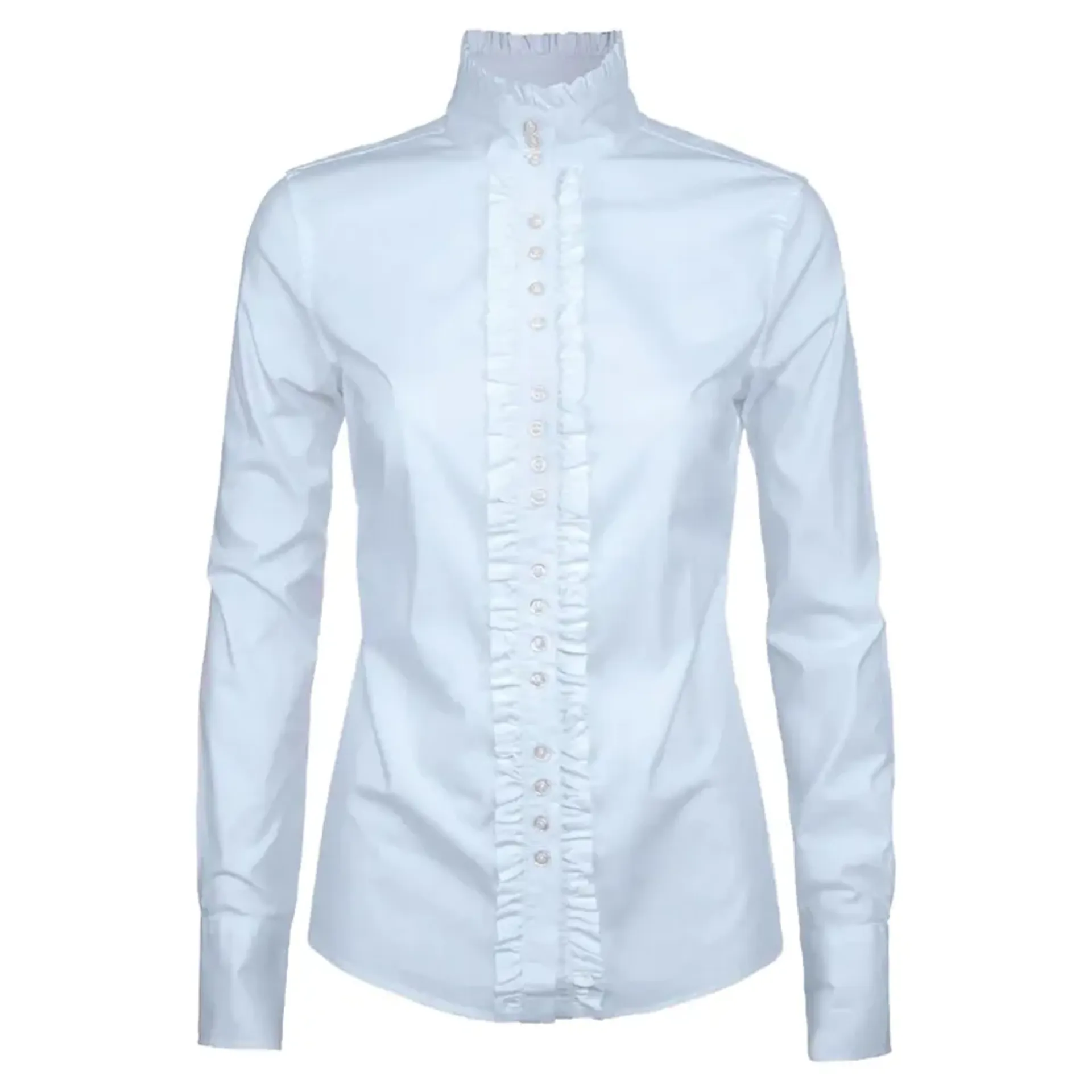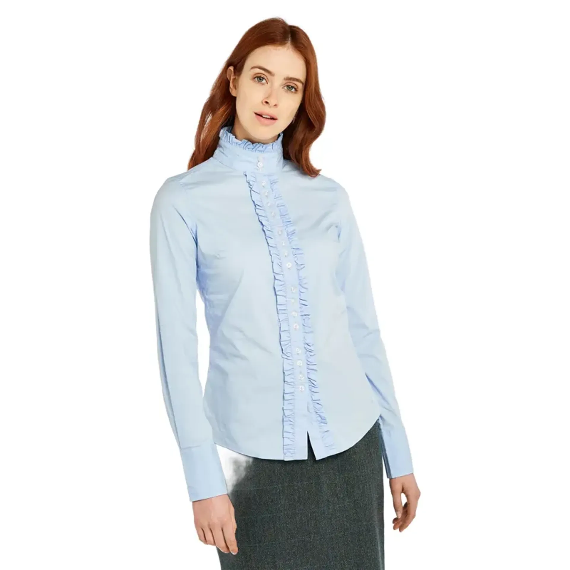 Dubarry Chamomile fitted ladies ruffle shirt. A beautifully cut fitted shirt with French seams, ruffle detailing and a stand up collar. Perfect with jeans or skirts to add that smart touch in soft to the touch stretch cotton.