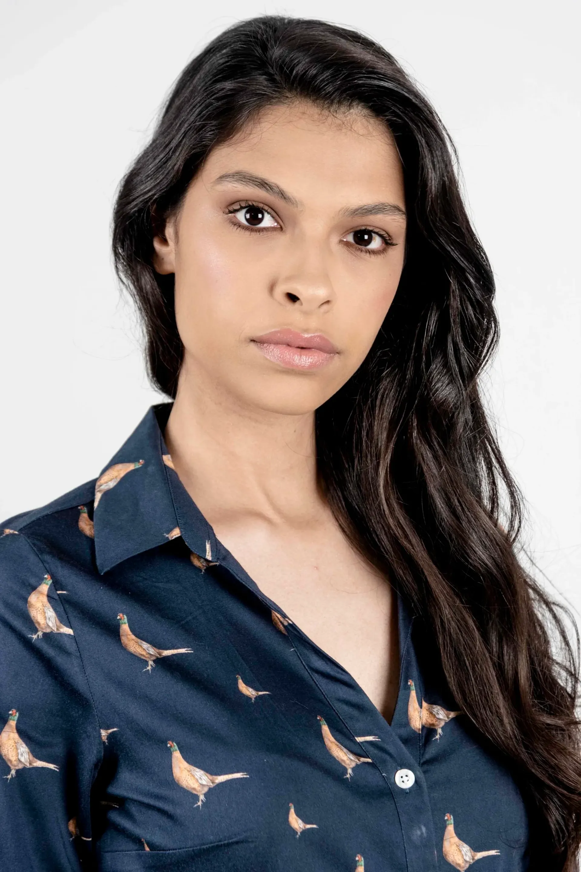 The Harper luxury blouse is elegant and stylish, in Navy with a Pheasant print . Featuring a deep notch neck and luxury cotton fabric.