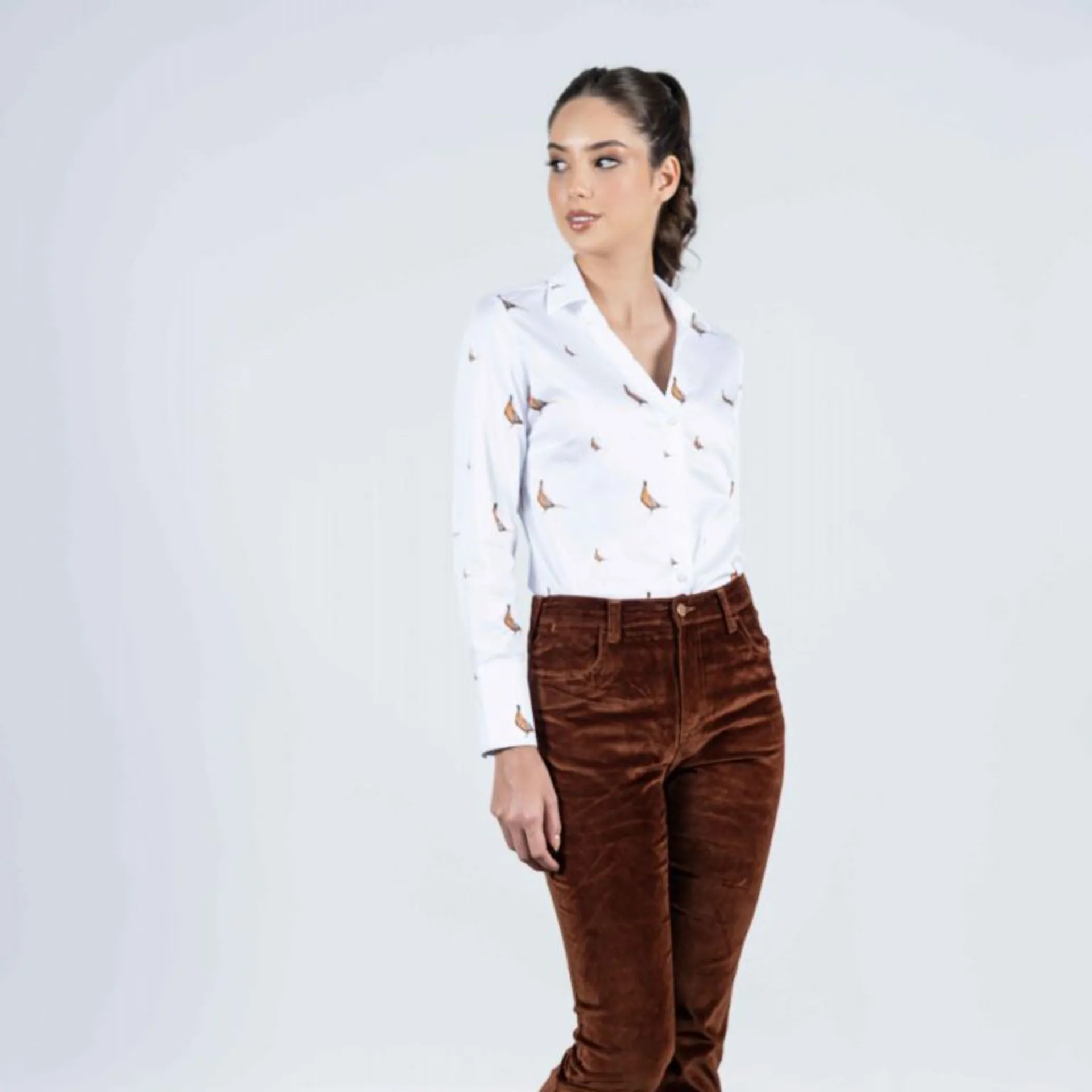 The Harper luxury blouse is elegant and stylish, in White with a Pheasant print. Featuring a deep notch neck and luxury cotton fabric.
