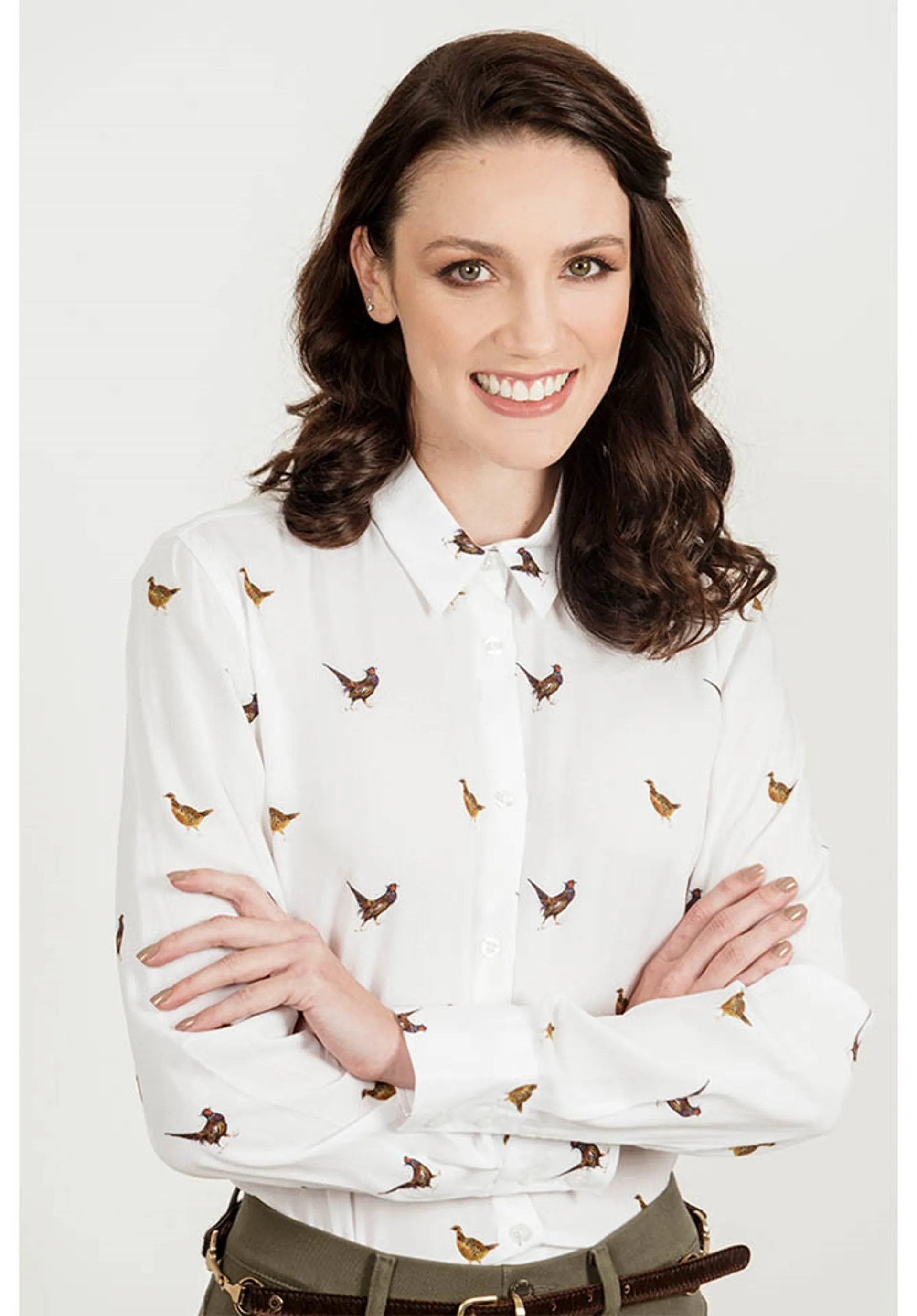 Hartwell Pheasants Blouse. A beautiful ladies white pheasant print blouse, this really striking blouse is a must for those who love the countryside and wild animals. Button up front. Cold wash and drip dry only.
