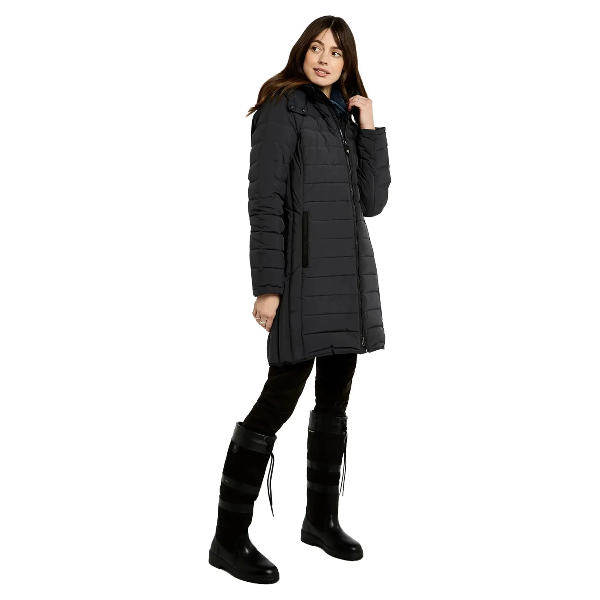 The Ballybrophy three-quarter length coat will keep you seriously warm. Filled with ethically sourced 90% down and 10% feather, it has a handwarmer pockets, a detachable hood and a full-length two-way zip. Ideal for weekend errands and walks with the dog. Match with some Dubarry country boots for head-to-toe toastiness.