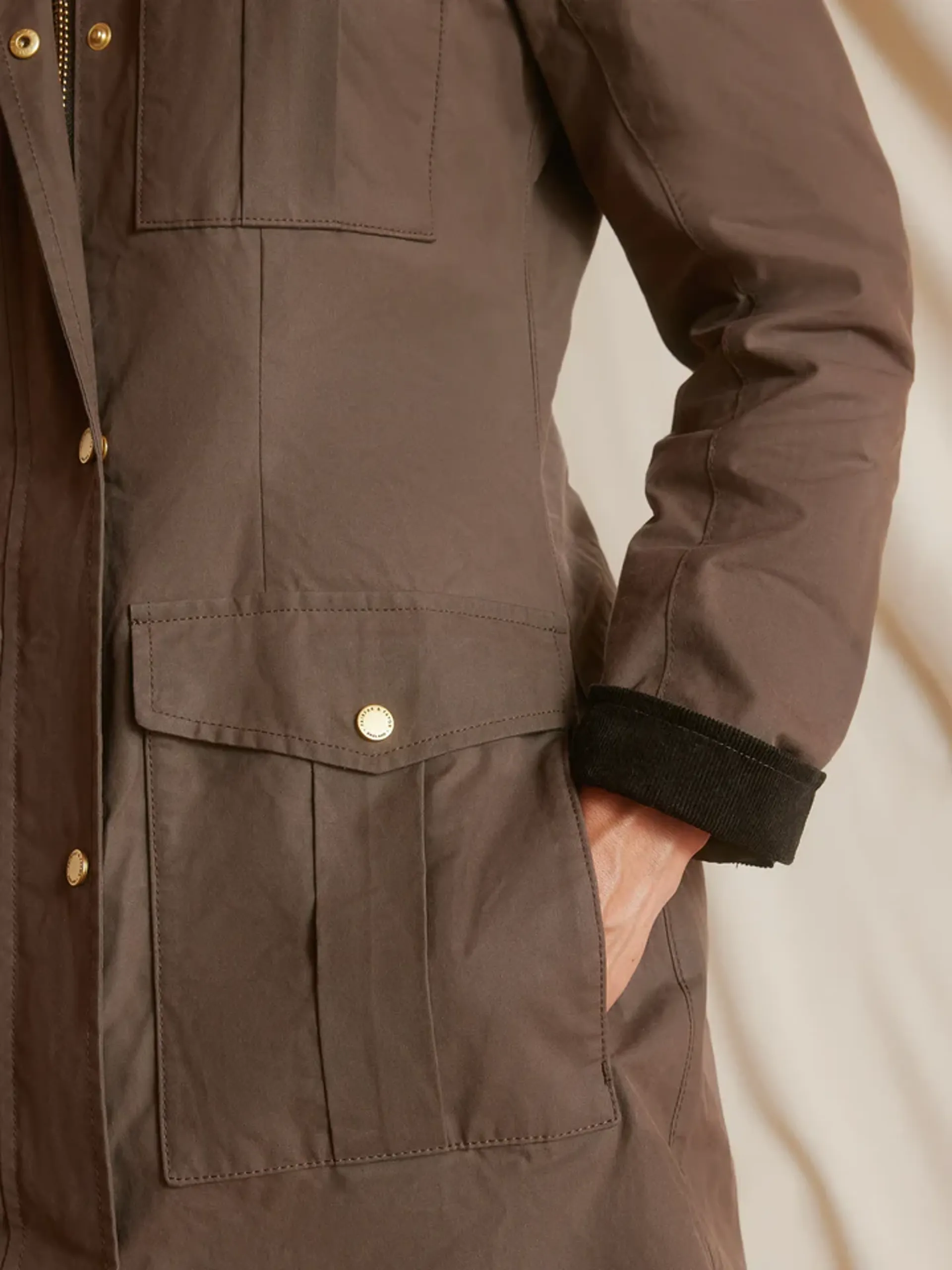 • Luxury Hardware: Finished with antique brass hardware and a branded front zip, ensuring the coat is unmistakably Fairfax & Favor.