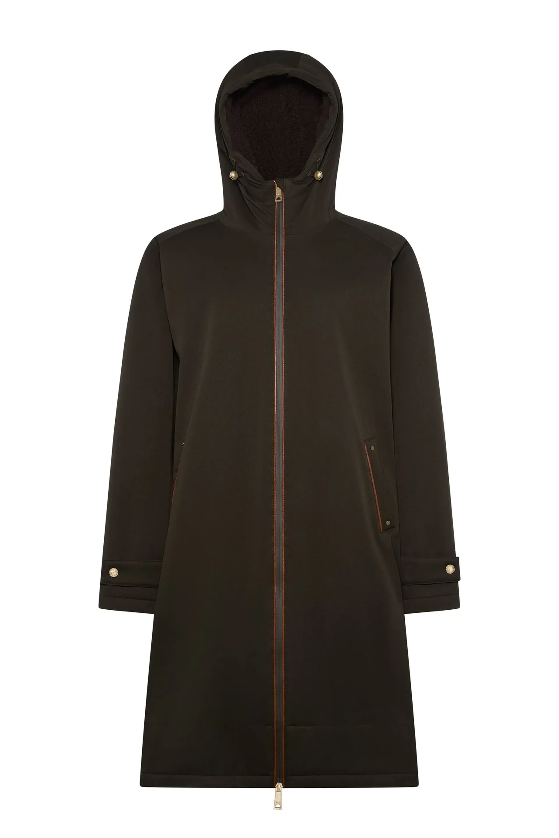 Crafted with a waterproof outer shell fabric and fully taped waterproof seams, the full zip closure and cuff adjustment provides both functionality and versatility. Featuring a borg lined hood with welt pockets to the front, the faux leather piping enhances this practical piece.