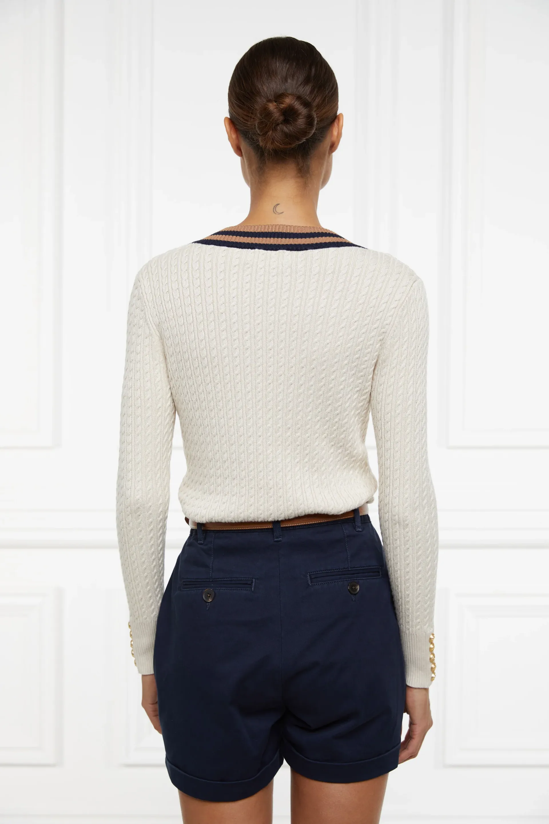 This classic chino short design has a slightly relaxed silhouette, they are sure to become an everyday summer staple. With a flattering mid-rise waist and stretch brushed cotton fabric, belt loops and pockets. Detailed with hand-drawn internal pockets with mock horn button fastenings and classic gold hardware.