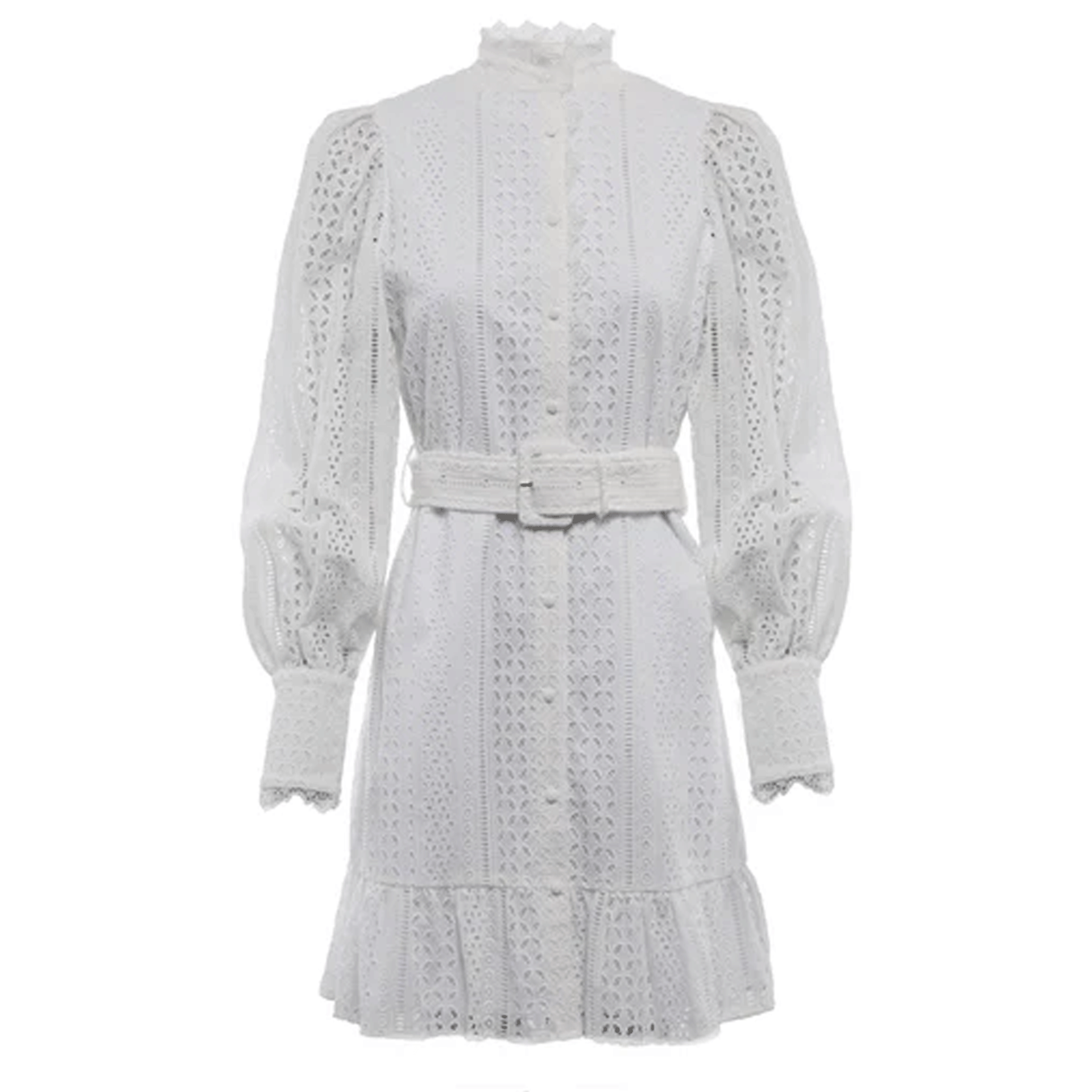 The top of the dress is crafted in a broderie-style, collarless shirt design, with a grandad collar beautifully edged in delicate eyelash lace. A full button-down placket along the center front enhances its refined aesthetic.