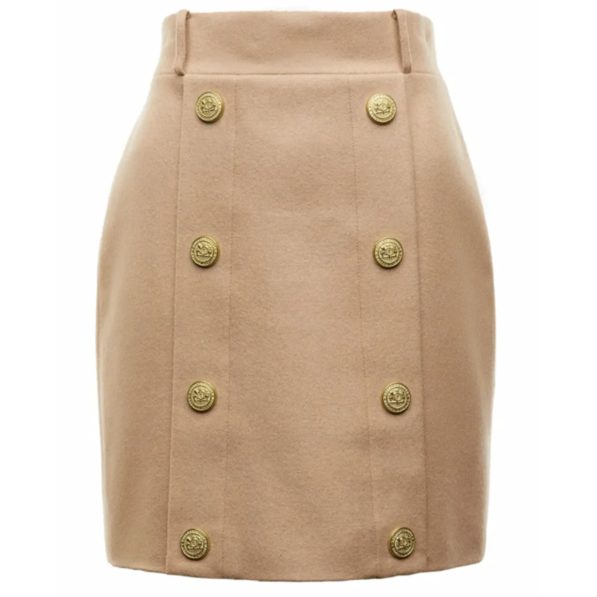 Holland Cooper Knightsbridge mid length skirt, fully lined, and cut for a close fit. Beautiful camel coloured wool cloth accented by gold rivets and engraved with the Holland Cooper crest.