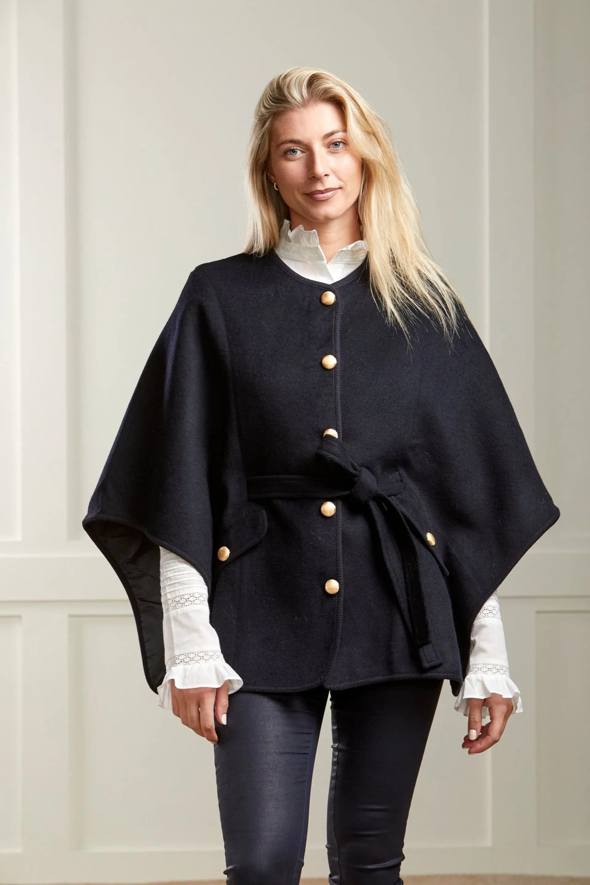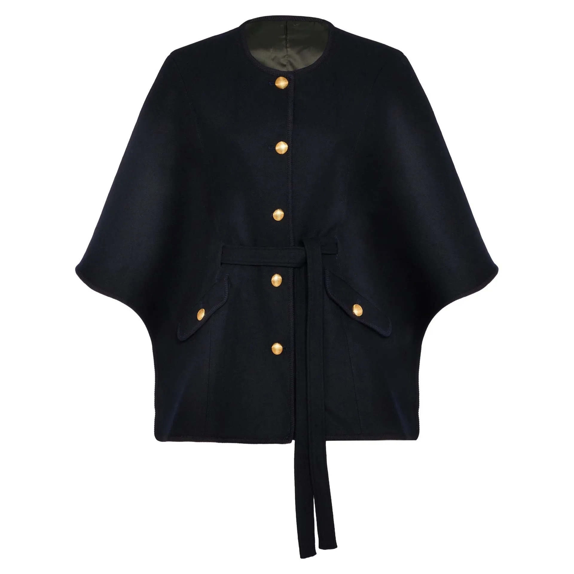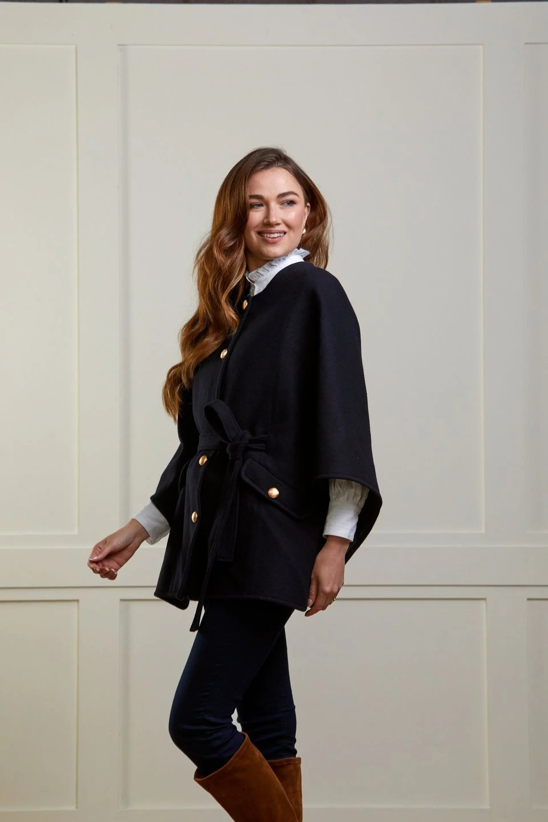 The clever design gives you all the flexibility and style of a cape, but flatters and enhances your silhouette at the same time. Beautifully tailored princess seams to the front and back trace the curves of the body, while a tie belt cinches in the waist giving a flattering and slimming effect.