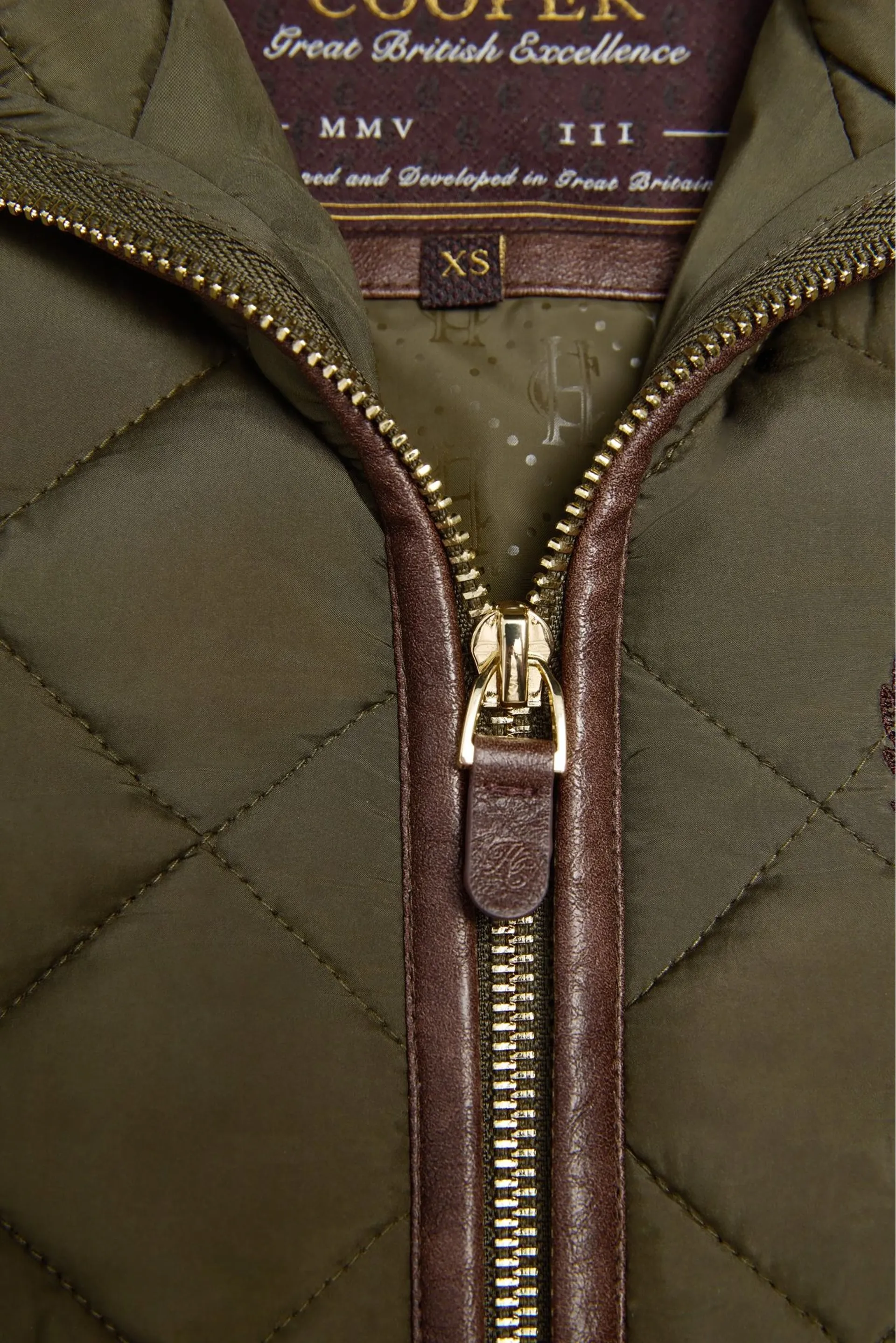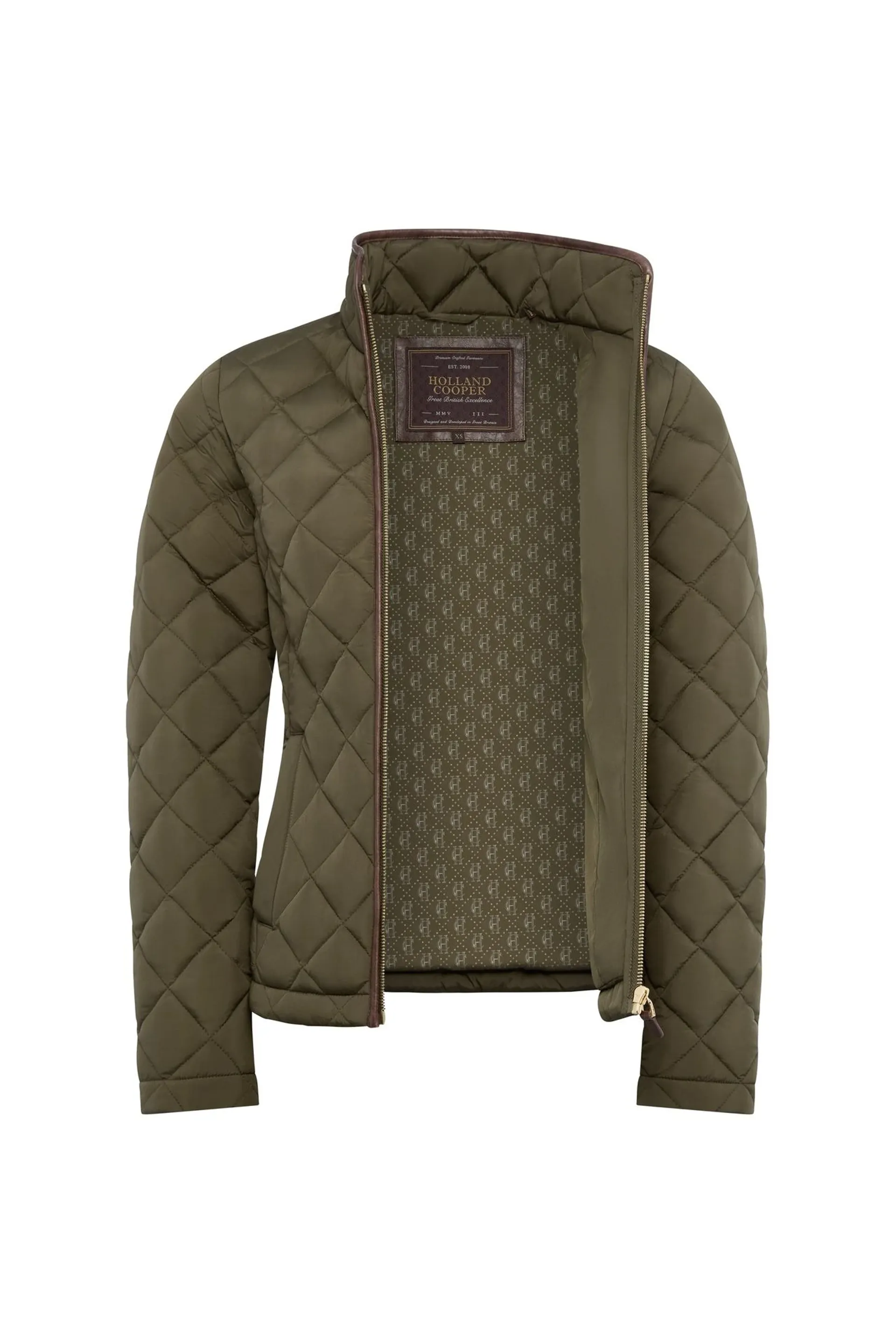 The latest evolution of the iconic diamond quilt series, this jacket is cut to a slim fit. This versatile layer features classic diamond quilting through the body and sleeves, offering lightweight warmth without bulk. Faux leather binding along the front closure and collar edges adds a touch of luxury, while antique brass zips lend a timeless finish.