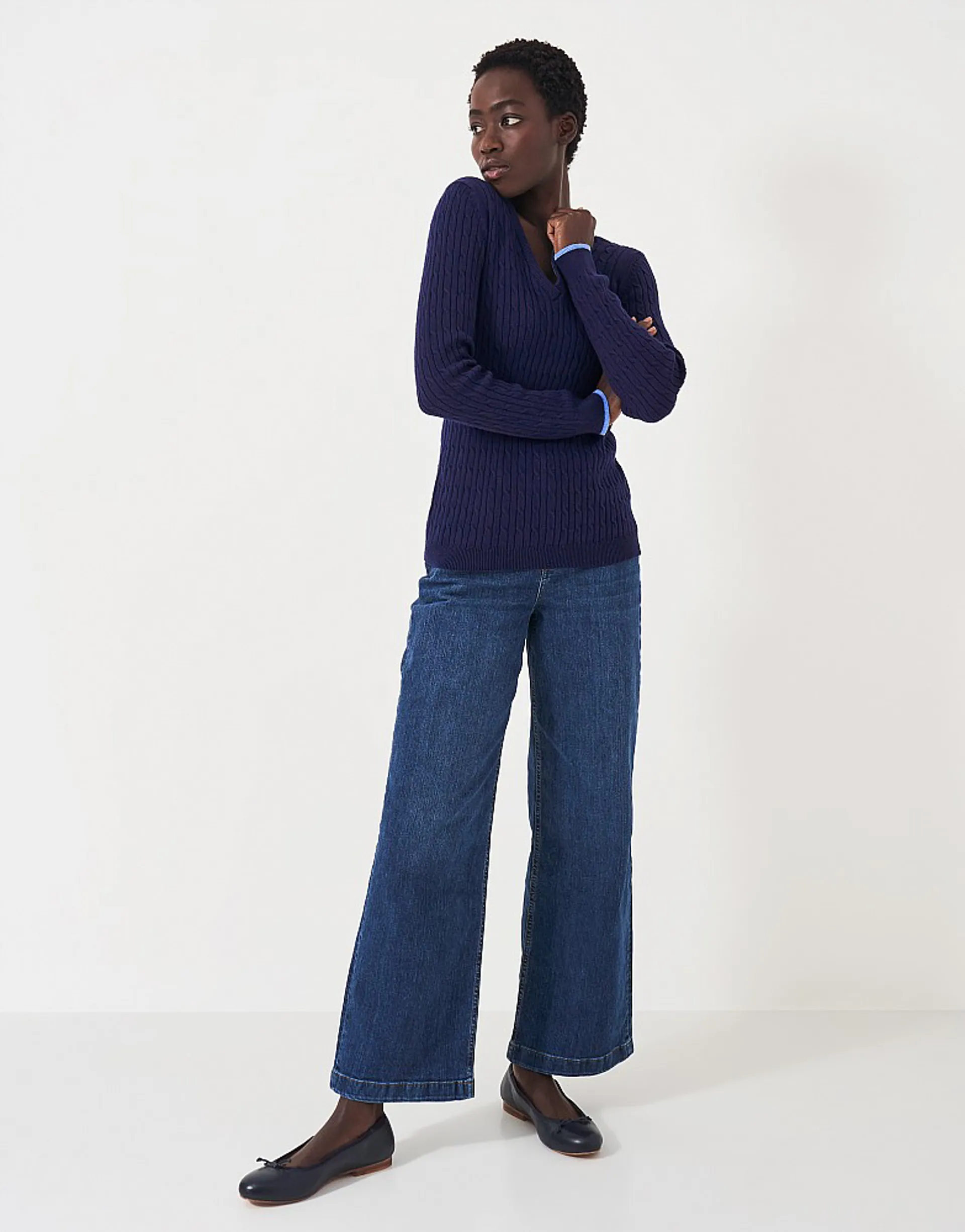The Crew v neck cable jumper. It’s crafted from a cotton and cashmere blend for a supersoft hand feel. A wardrobe classic you’ll turn to time and time again, with cornflower blue accents.