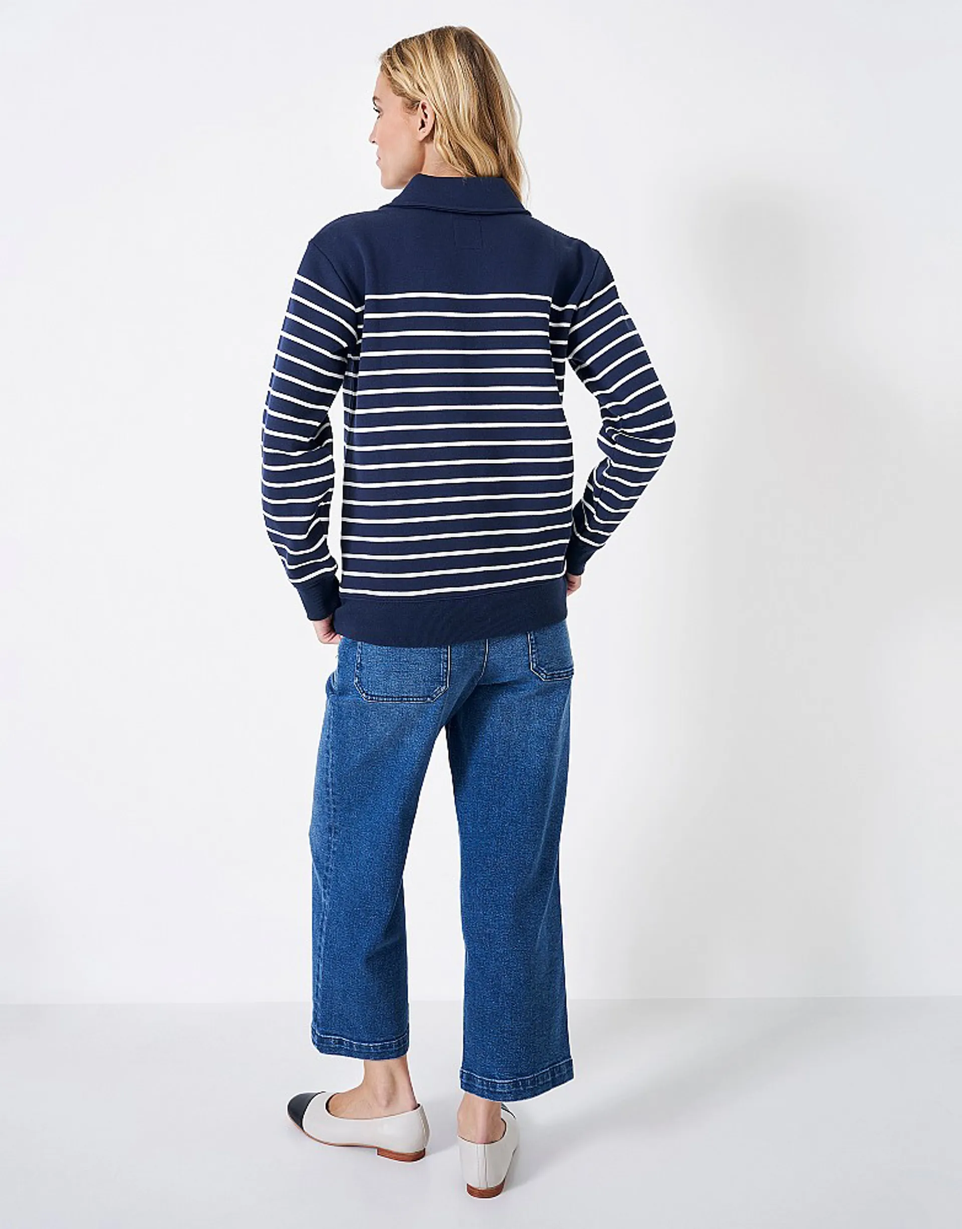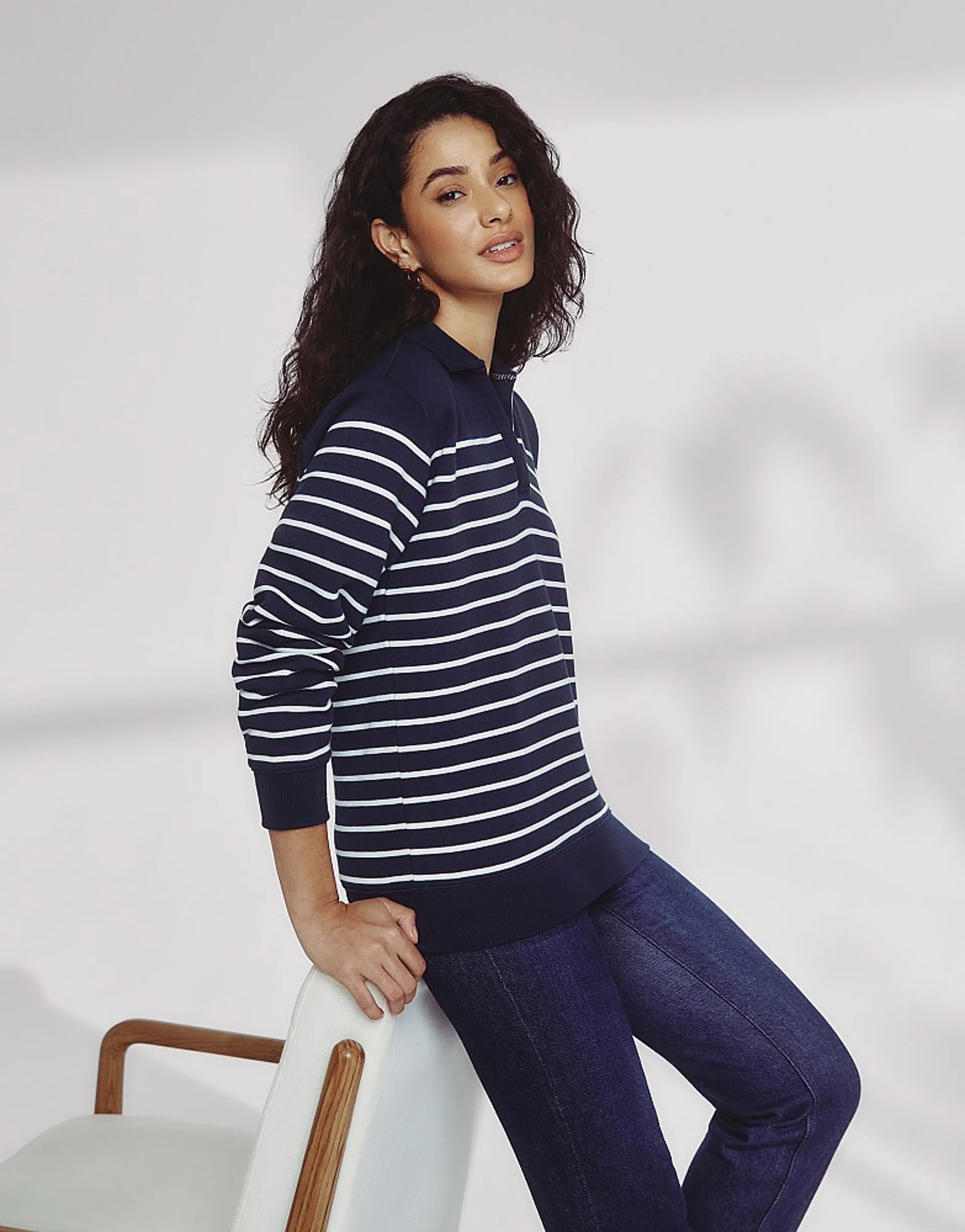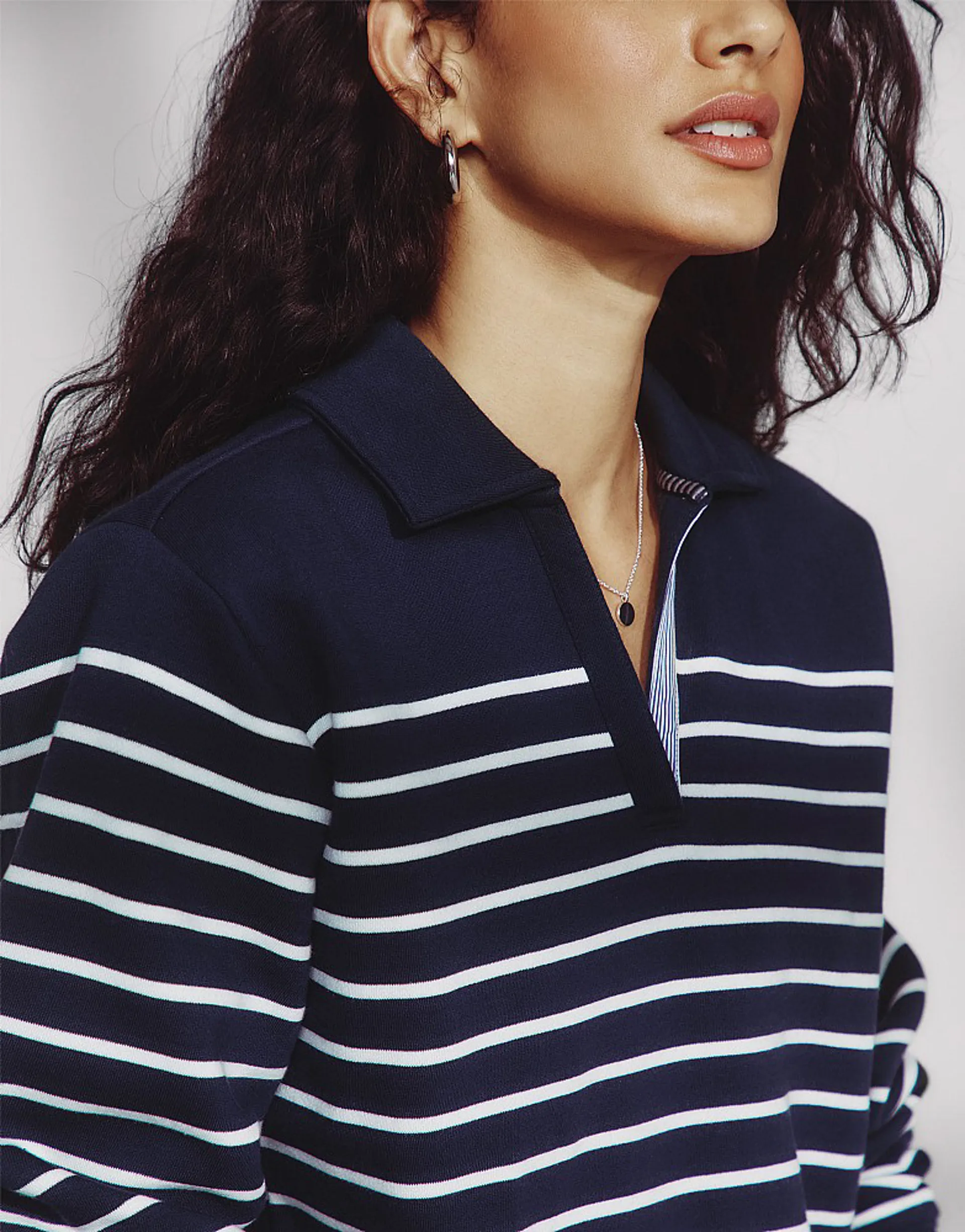 A sweat top in a navy and white stripe. Comfortable and relaxed, featuring the stripe detailing on the placket and the stylish open collar. Throw it on with jeans for a casual everyday look.