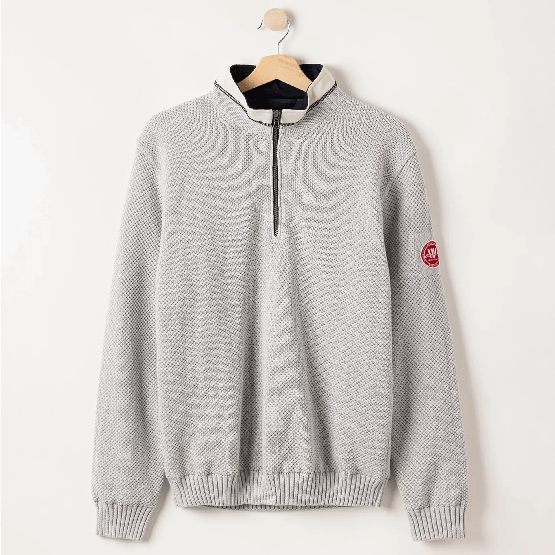 Mens waffle knit 1/4 zip sweater with windproof lining. The jumper has a high collar with ribbed hem and cuffs. Great for keeping yourself warm and keeping the wind out.