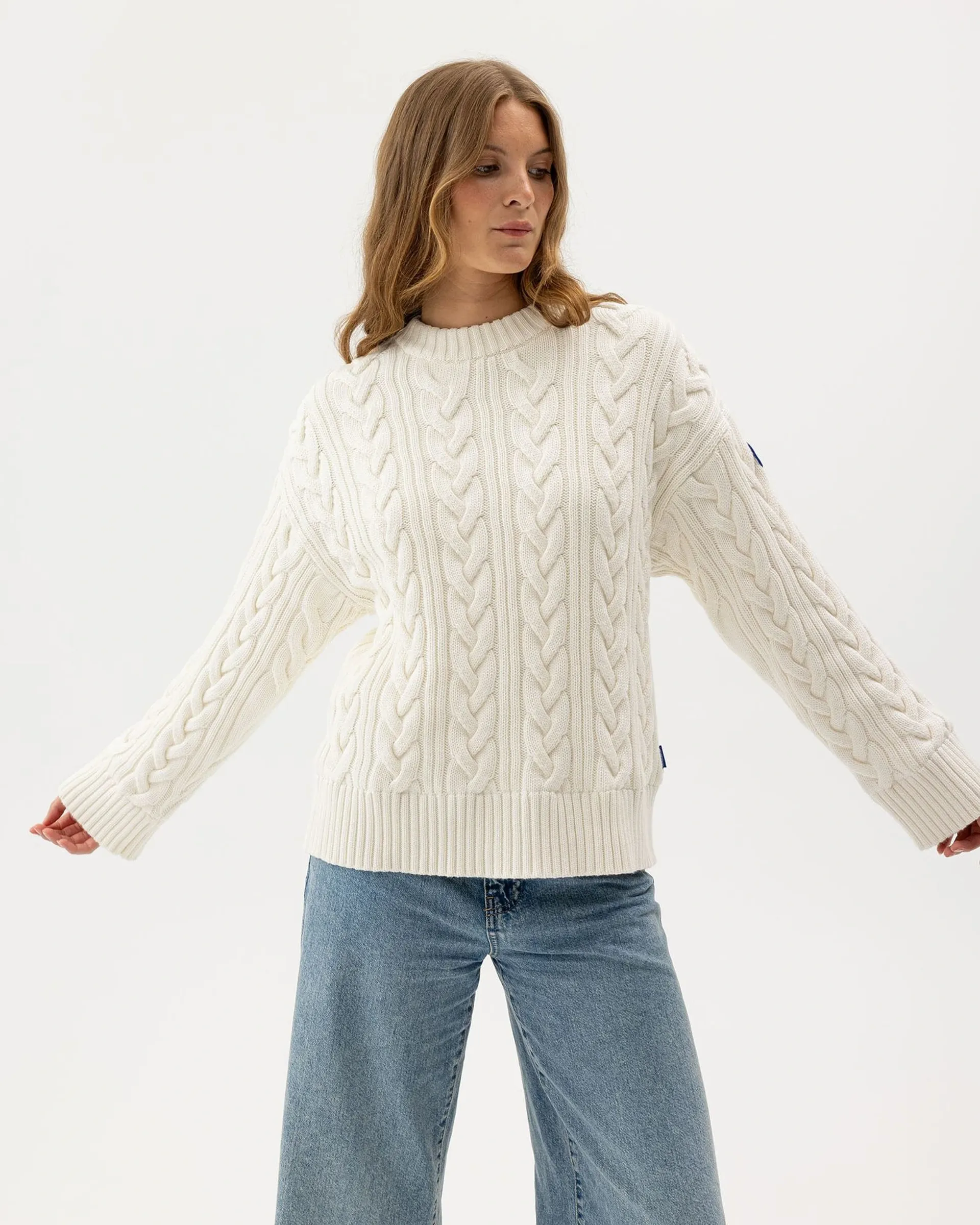 The Juno Crew WP features a cable knit pattern all over and includes ribbed cuffs and endings for comfort and fit. This garment is sustainably produced in Europe.