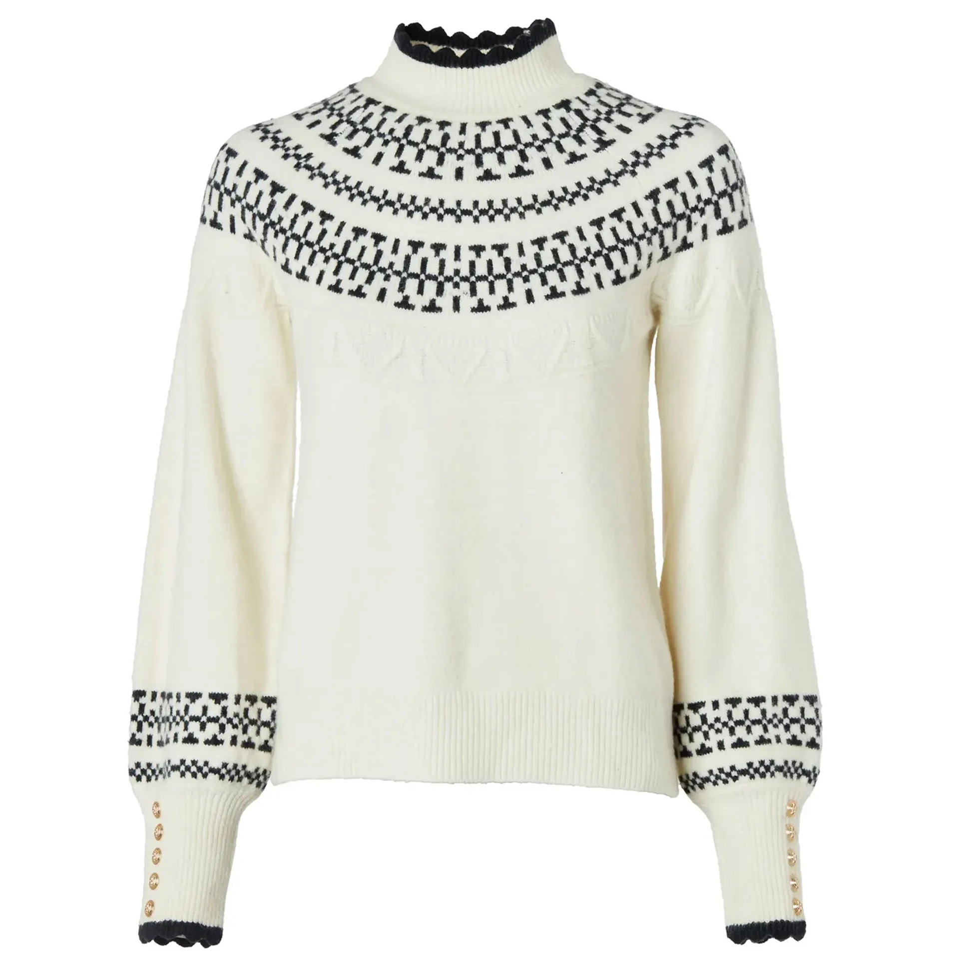 The Elodie Roll Neck Knit features a classic Fairisle pattern with cable detailing and voluminous, feminine raglan sleeves, this knit offers a cozy, yet refined look. The roll neck is accented with contrast scallop edging, adding a unique touch, while signature hardware on the cuffs completes the piece with a touch of sophistication. Ideal for layering or wearing on its own, this knit is a perfect blend of comfort and elegance.