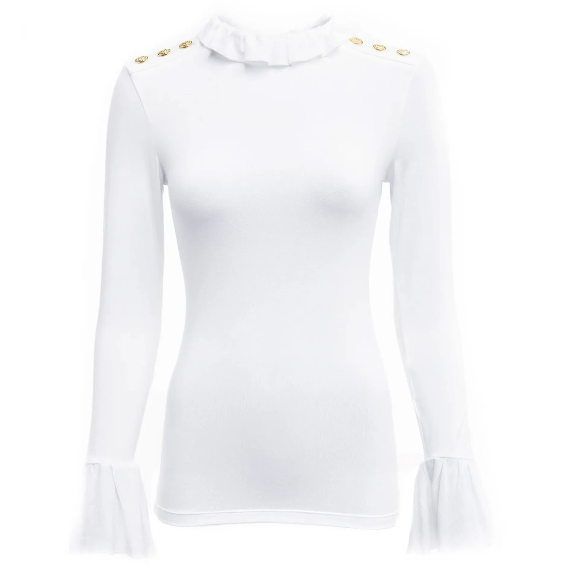 Elegant and sophisticated the Lilibet Ladies Jersey Tee offers a stylish yet comfortable look. Features include a ruffled collar and cuffs, and the signature Holland Cooper rivets to the shoulder. A stunning top that you can dress up or down for that perfect look.