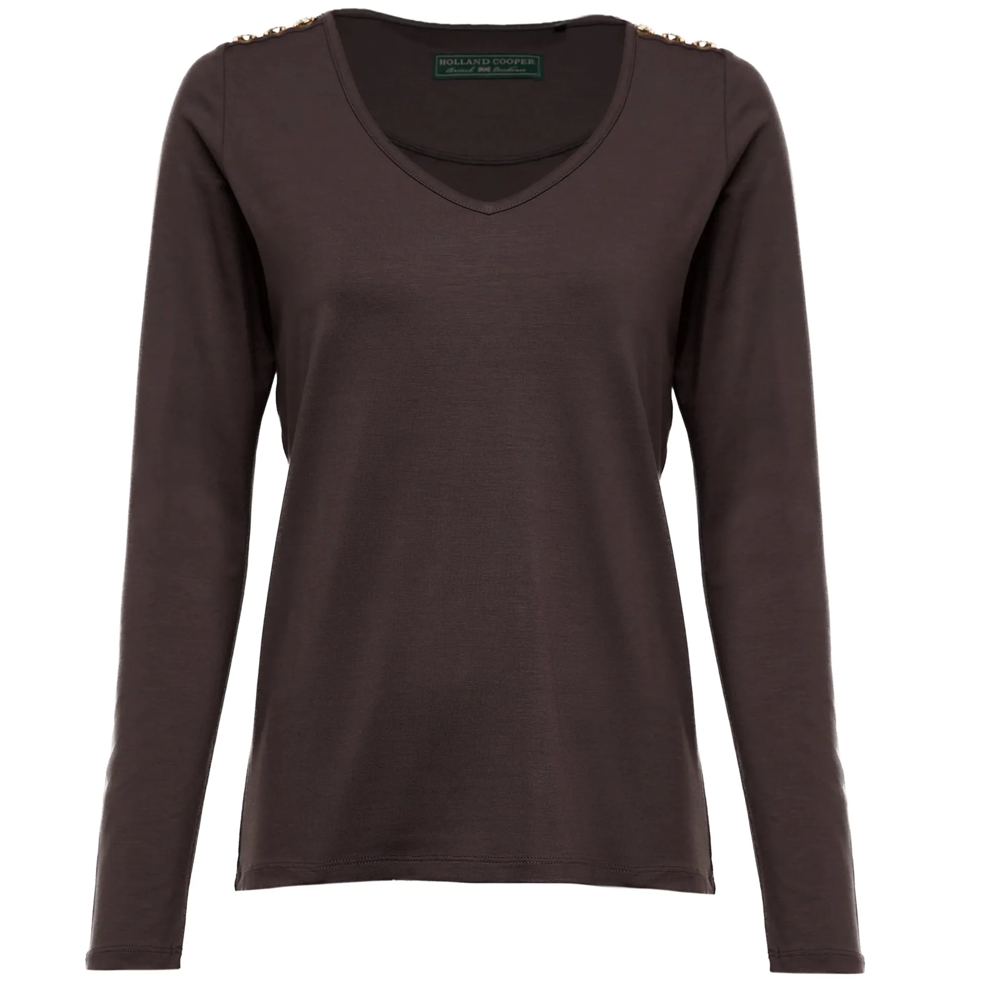 Holland Cooper Long Sleeve V-Neck Tee Coffee