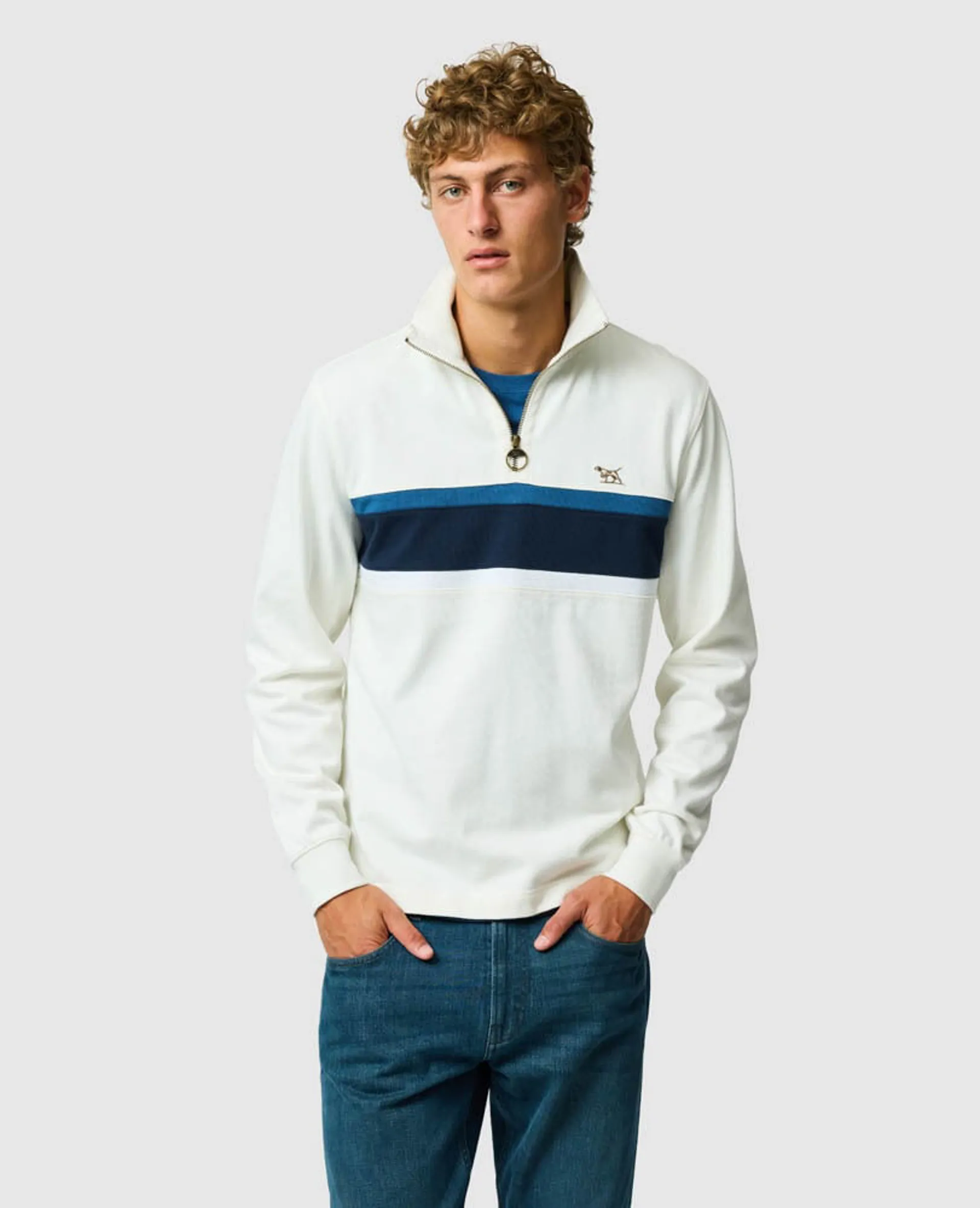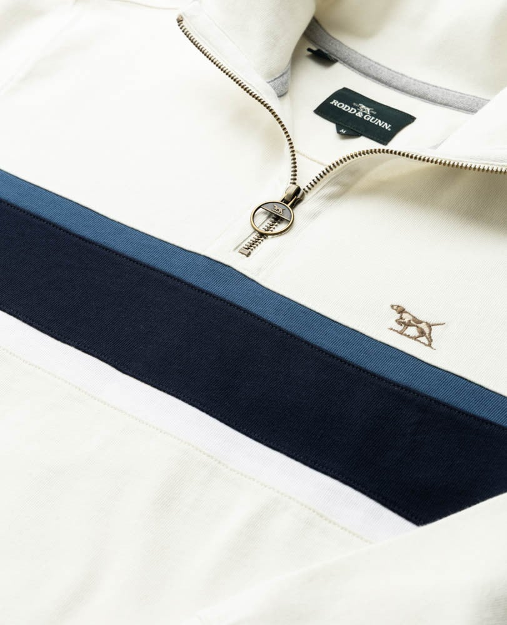 The tightly knit rugby fabric structure resists pilling while maintaining a naturally breathable hand-feel. Cut in Rodd & Gunn's iconic 1/4 zip style with contrast chest stripes and sportswear detailing, it is a versatile layer designed for everyday wear with the quiet confidence of real sports provenance.