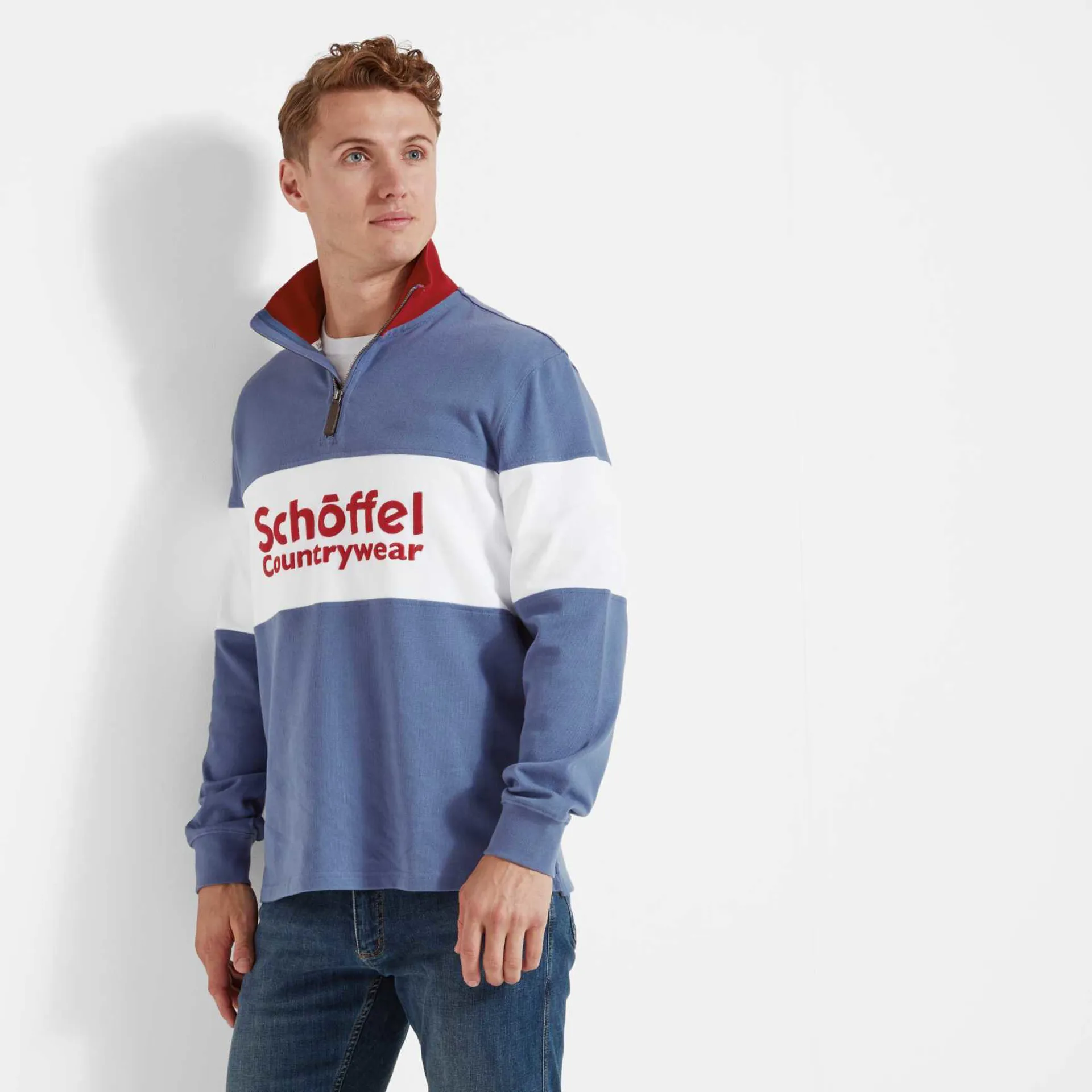 Exeter unisex rugby styled jumper, with a quarter zip. This relaxed fit long sleeved cotton jersey top, is the ideal casual piece to match with jeans. A popular styled jumper from the schoffel stable.