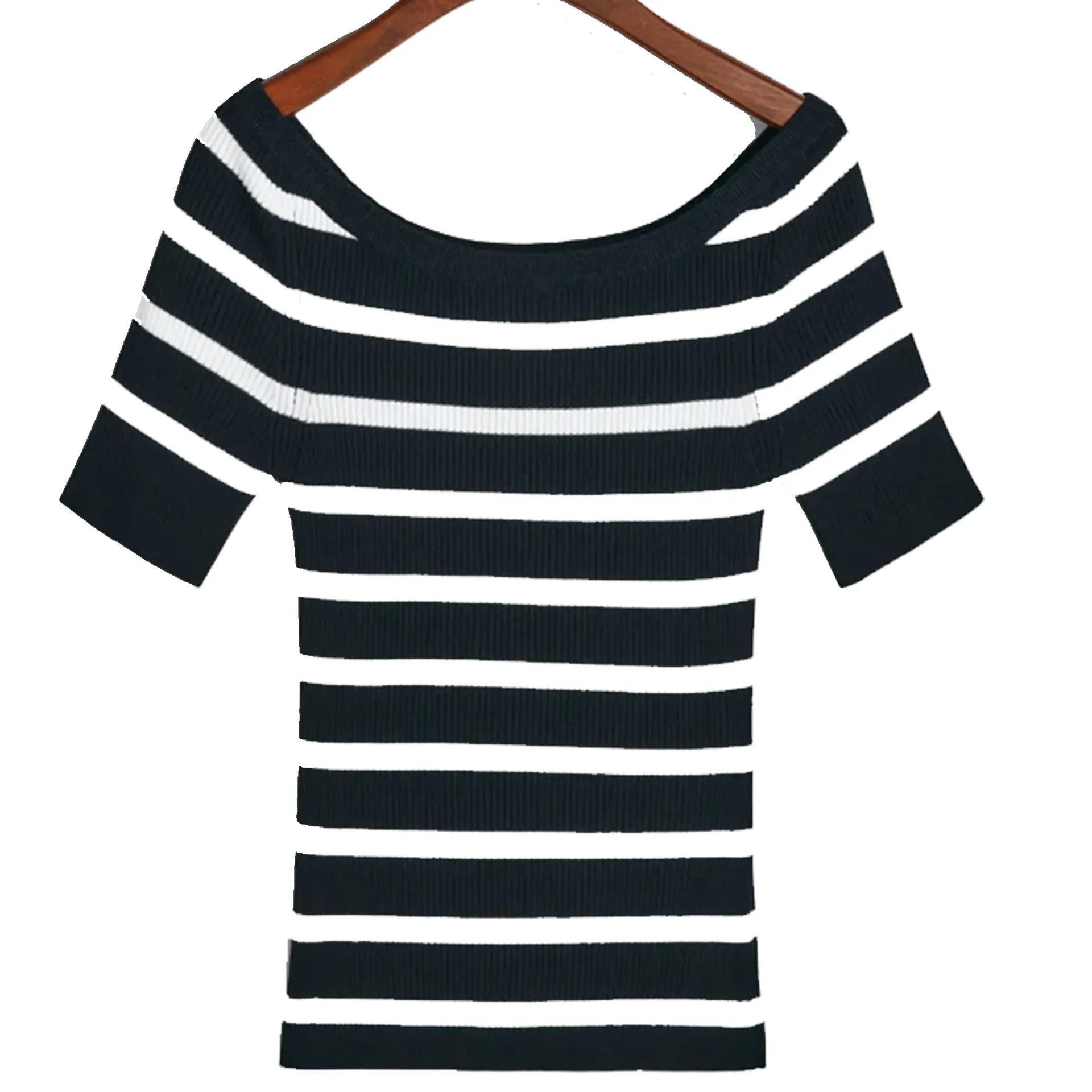 Question(s) answered about Gant Striped Rib Knit Off Shoulder Short Sleeve Top Evening Blue