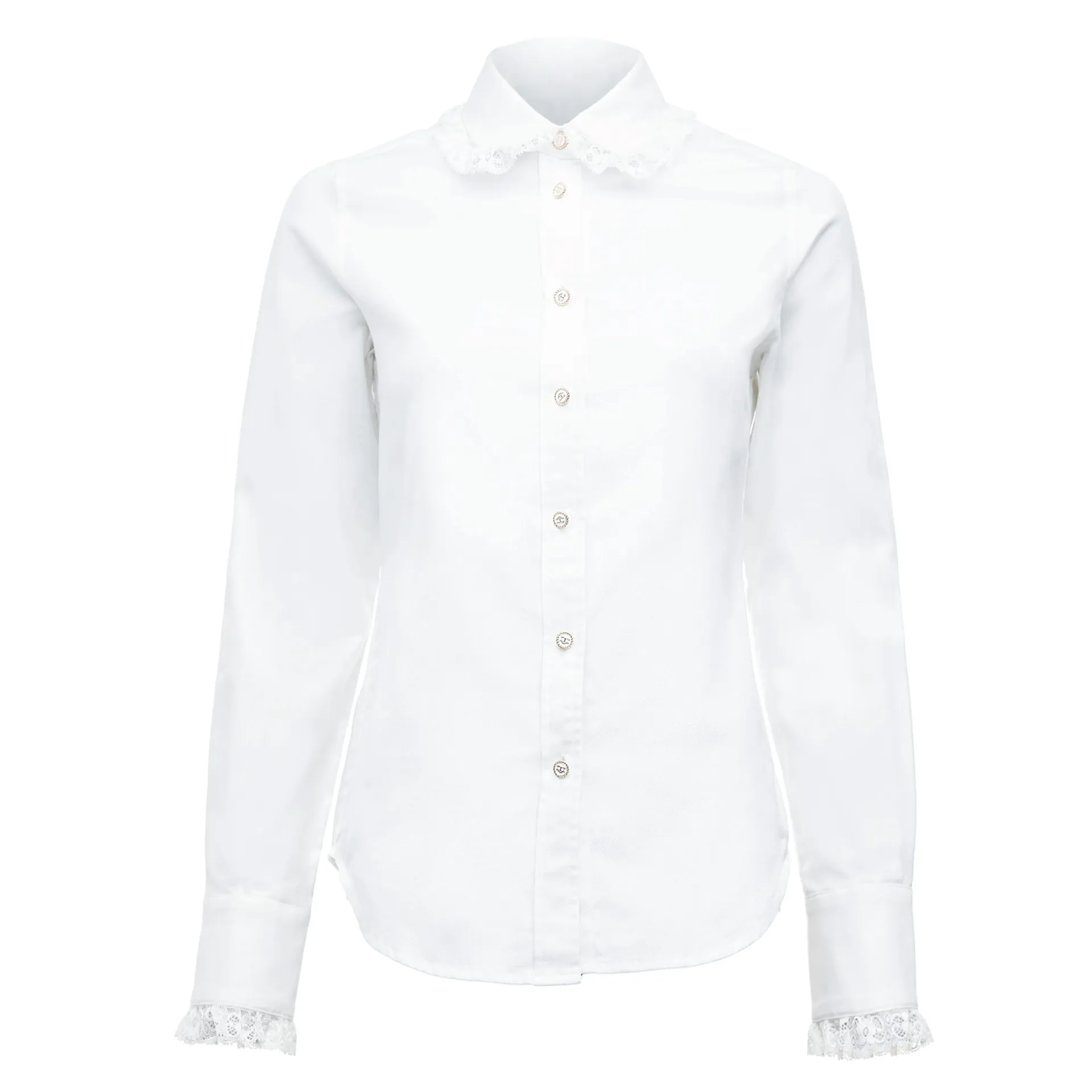 The Holland Cooper Rose Shirt features that feminine lace look, pretty and vibrant. Made from beautifully soft cotton the lace trims are perfect as an addition with the HC embroidery to the cuff, and enamel and gold buttons to finish the look.