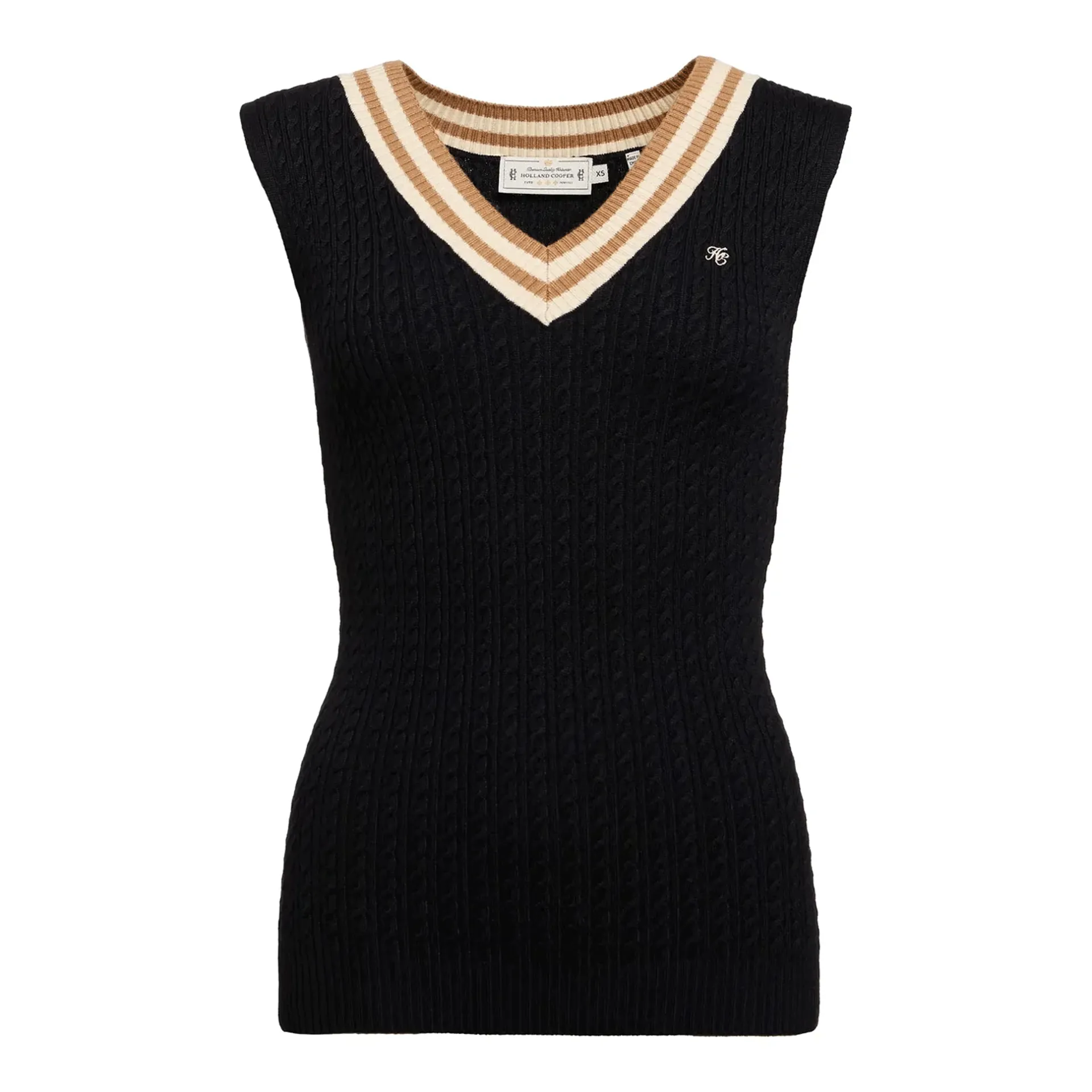 Cable knit tank top with contrasting stripe and small HC logo embroidered on the chest.