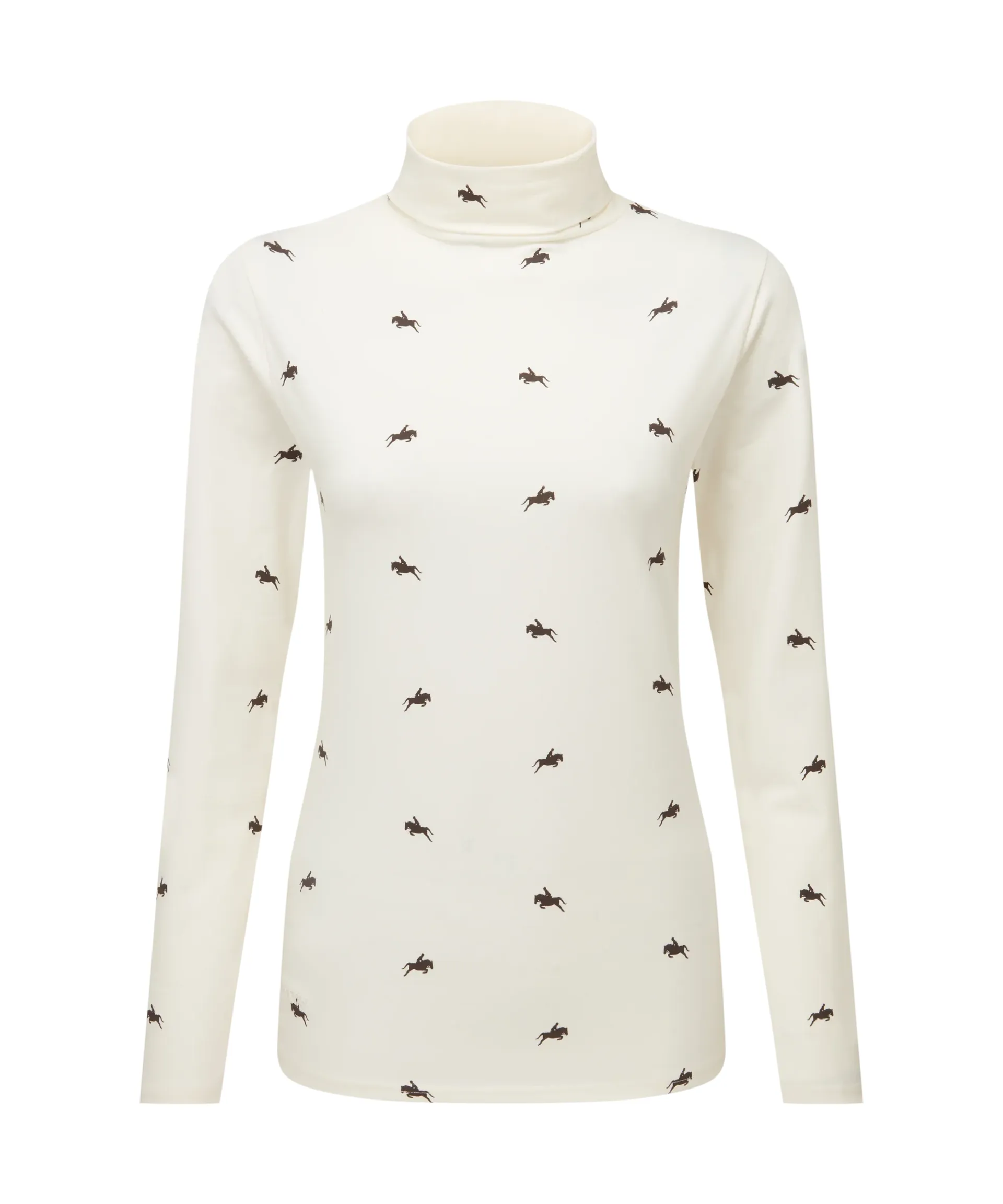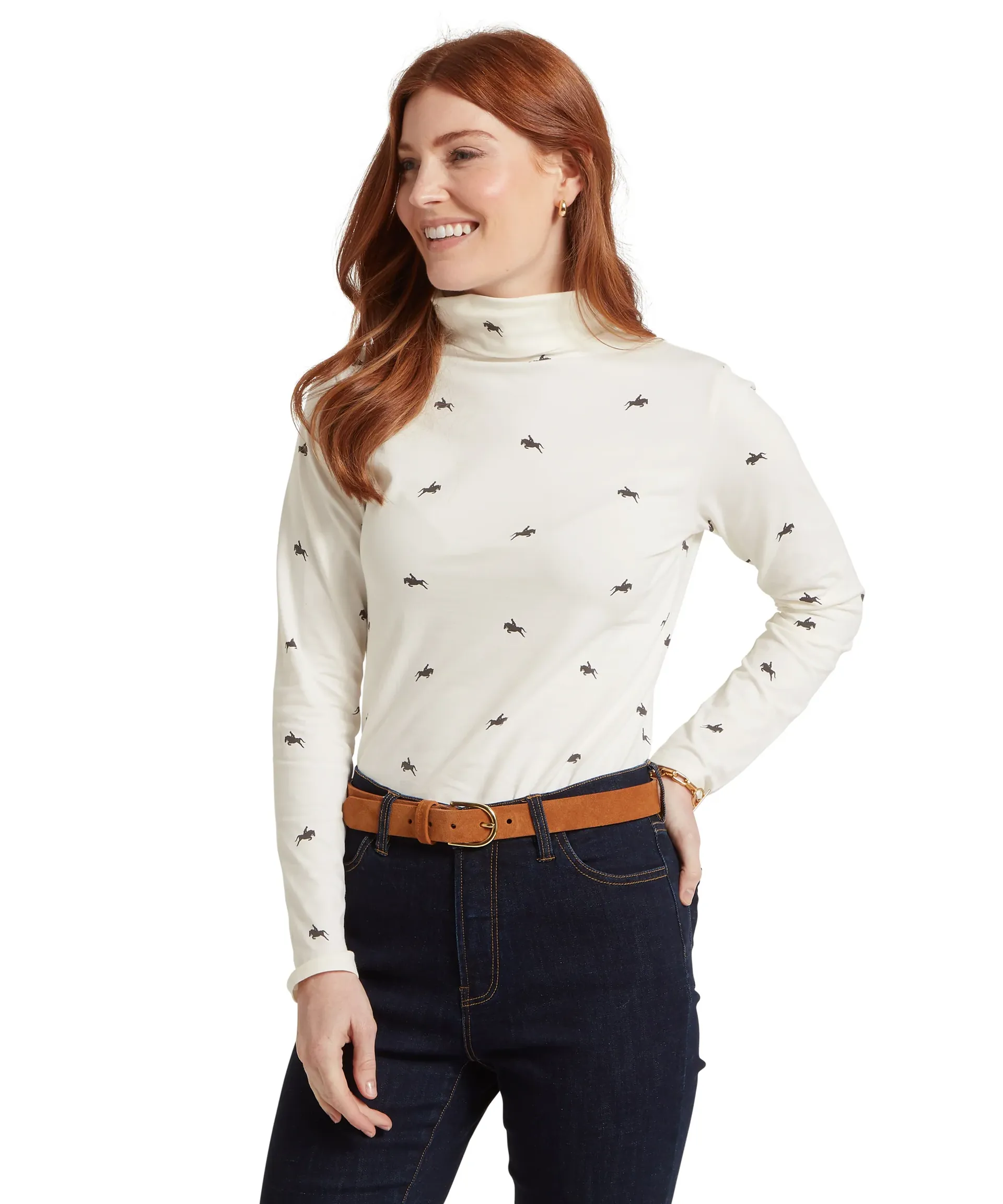 The slim-fitting women's Malham top bring together a soft stretch-jersey fabric, a roll neck, and a charming bay horse print in an easy-to-wear layer.