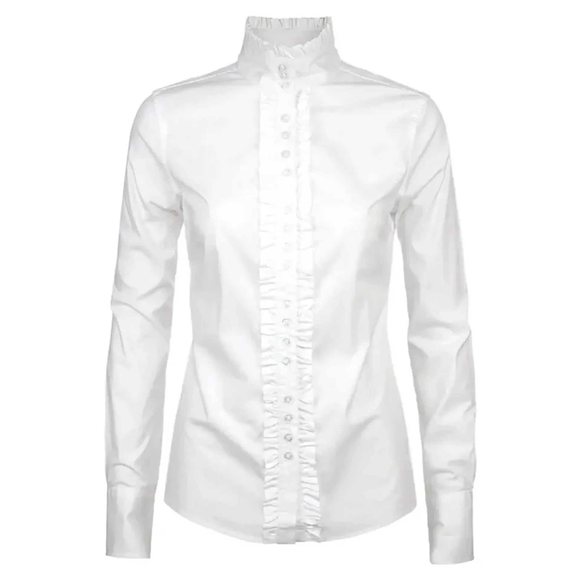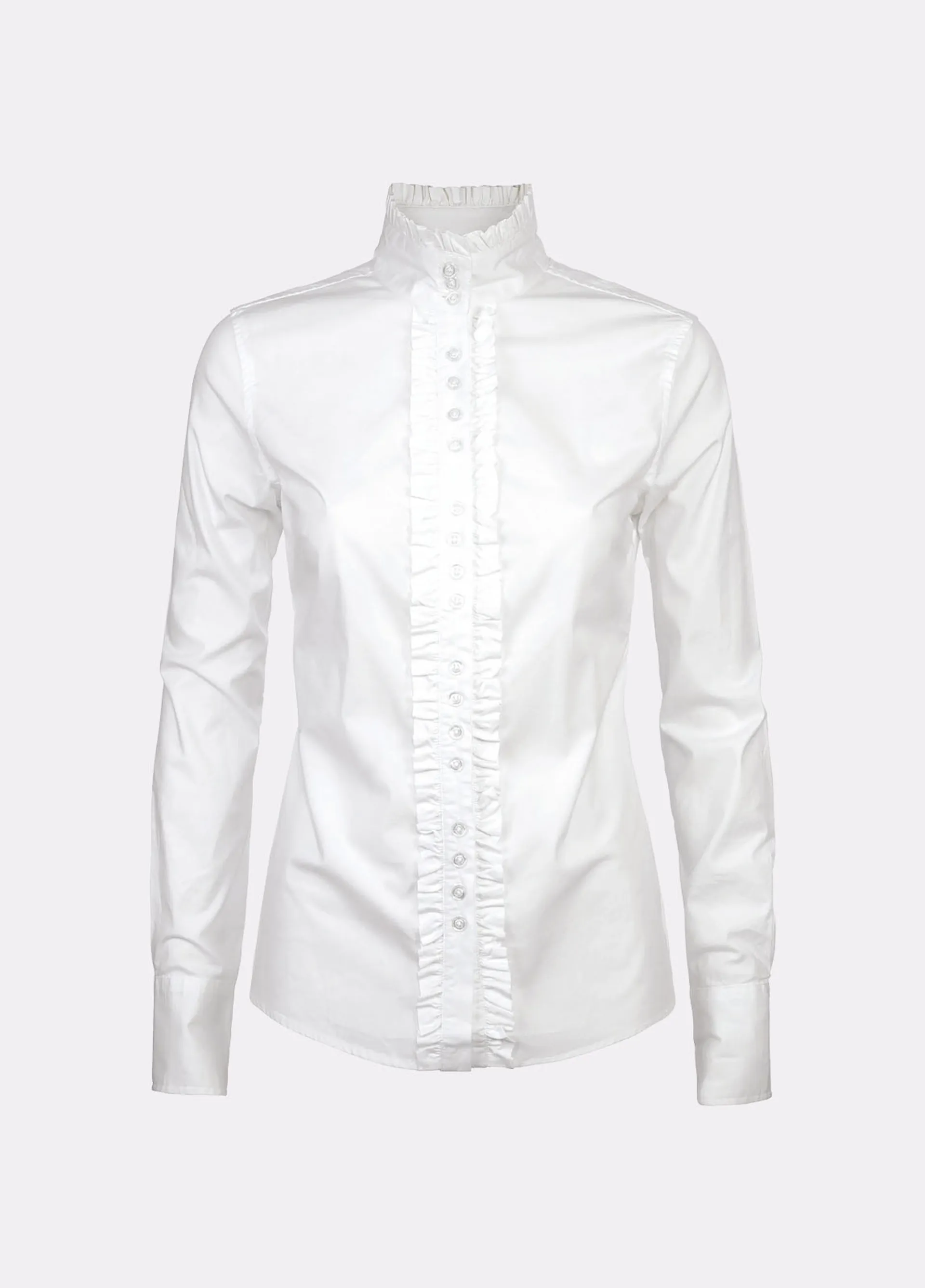Dubarry Chamomile fitted ladies ruffle shirt. A beautifully cut fitted shirt with French seams, ruffle detailing and a stand up collar. Perfect with jeans or skirts to add that smart touch in soft to the touch stretch cotton.