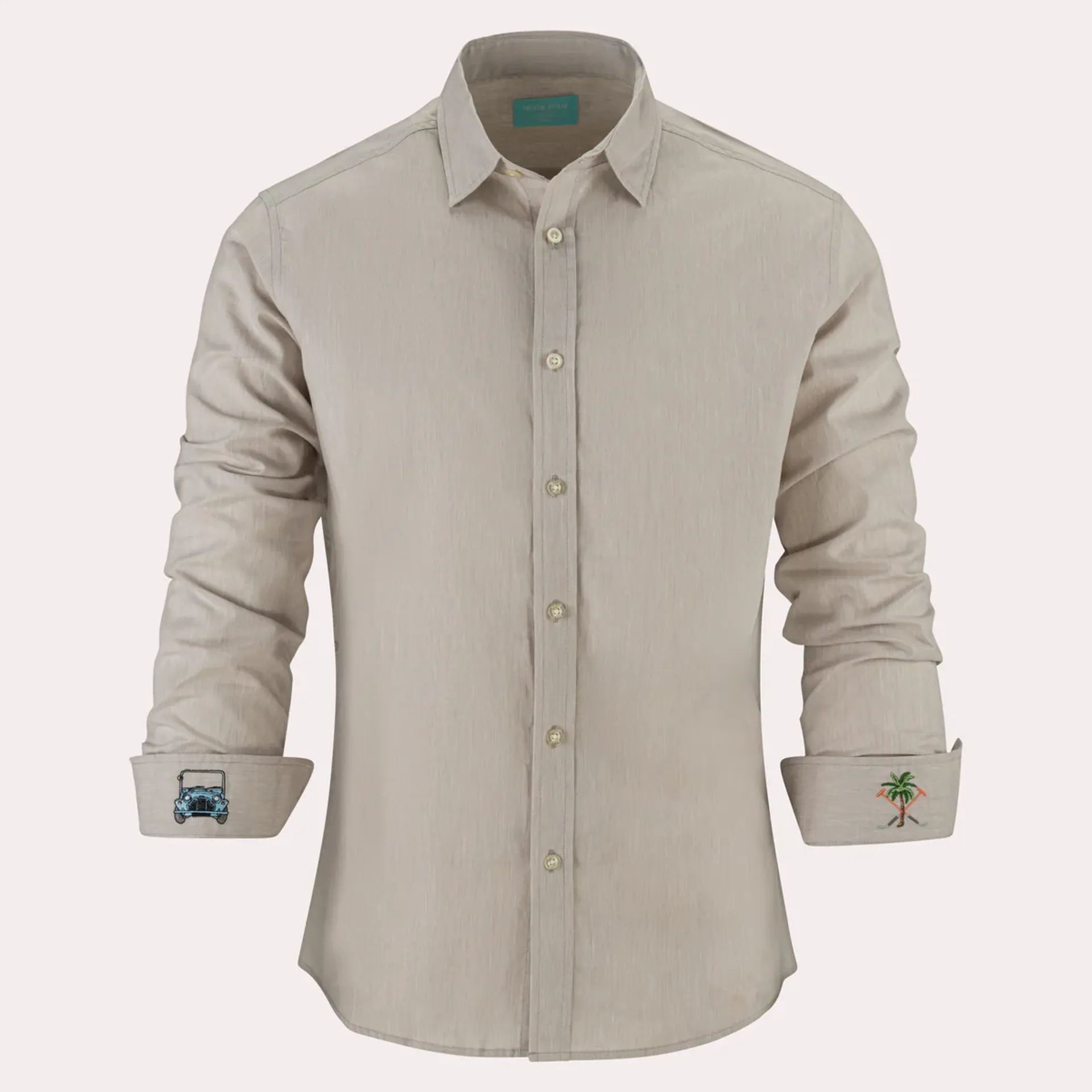 Whether worn casually with shorts or dressed up with tailored trousers, it offers versatile styling options. For an added detail, fold the cuffs to reveal intricate embroidery of palm trees, polo, and a classic Moke car—evoking the vibrant polo scenes of Sotogrande, and Miami and giving the shirt a sophisticated, playful touch.