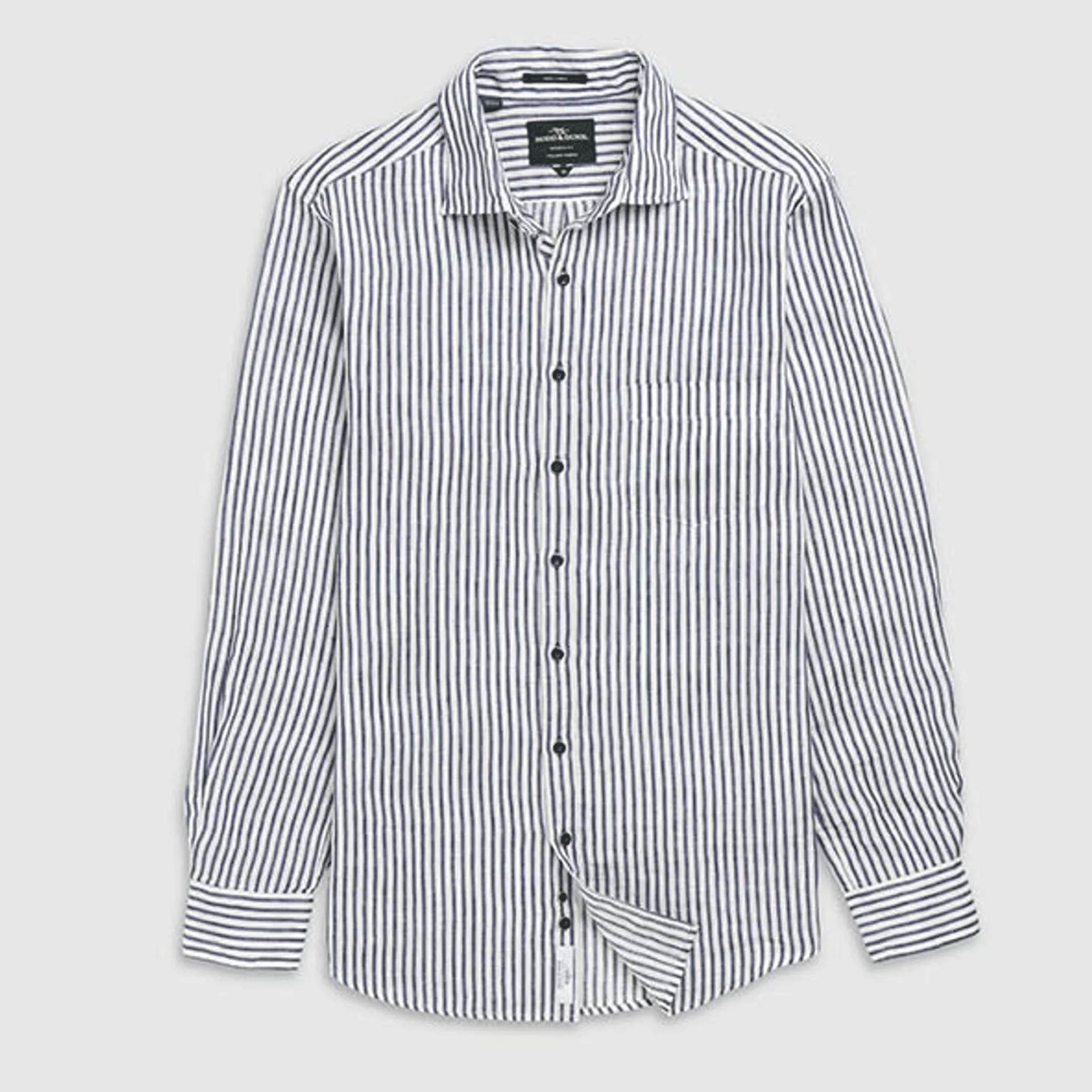 Long sleeve Navy striped linen shirt woven in Italy made from 100% sustainably grown European linen.