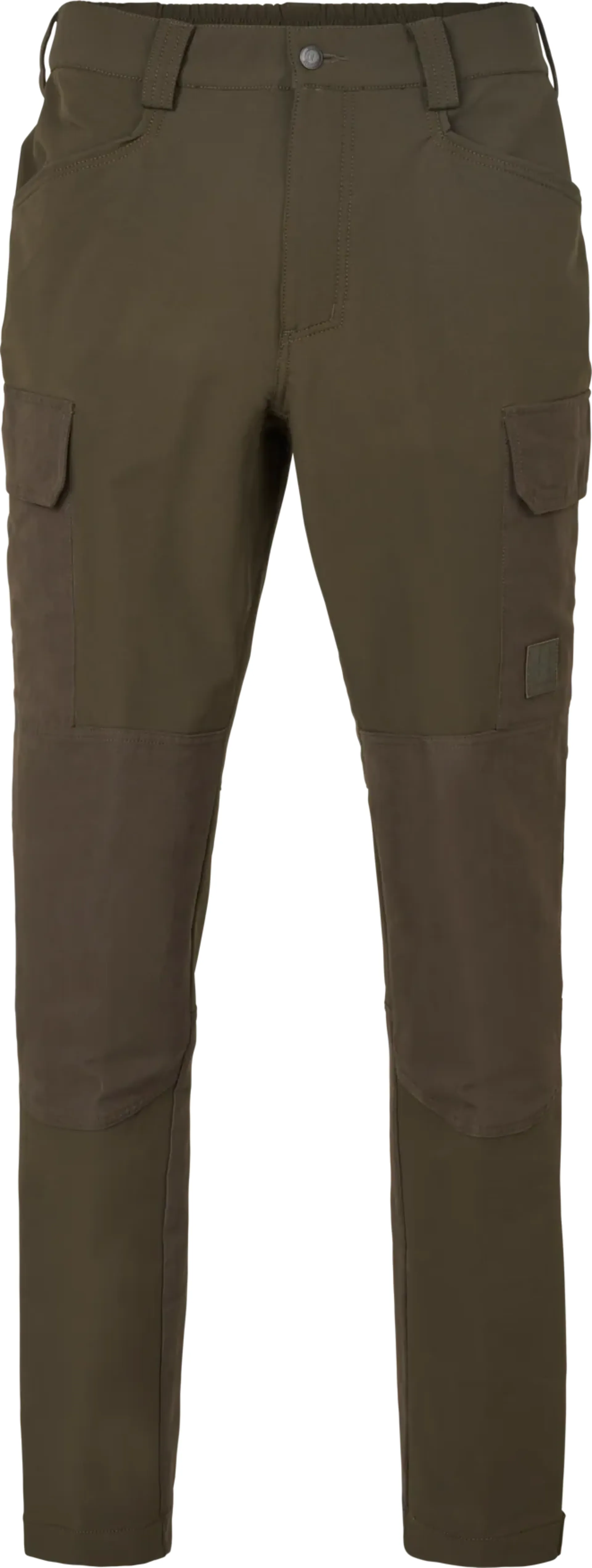 Durable Willow Green/Brown Hill Trousers from Härkila — silent magnetic thigh pockets, elastic back waistband, water‑repellent finish. Ideal for active hunting and country wear.