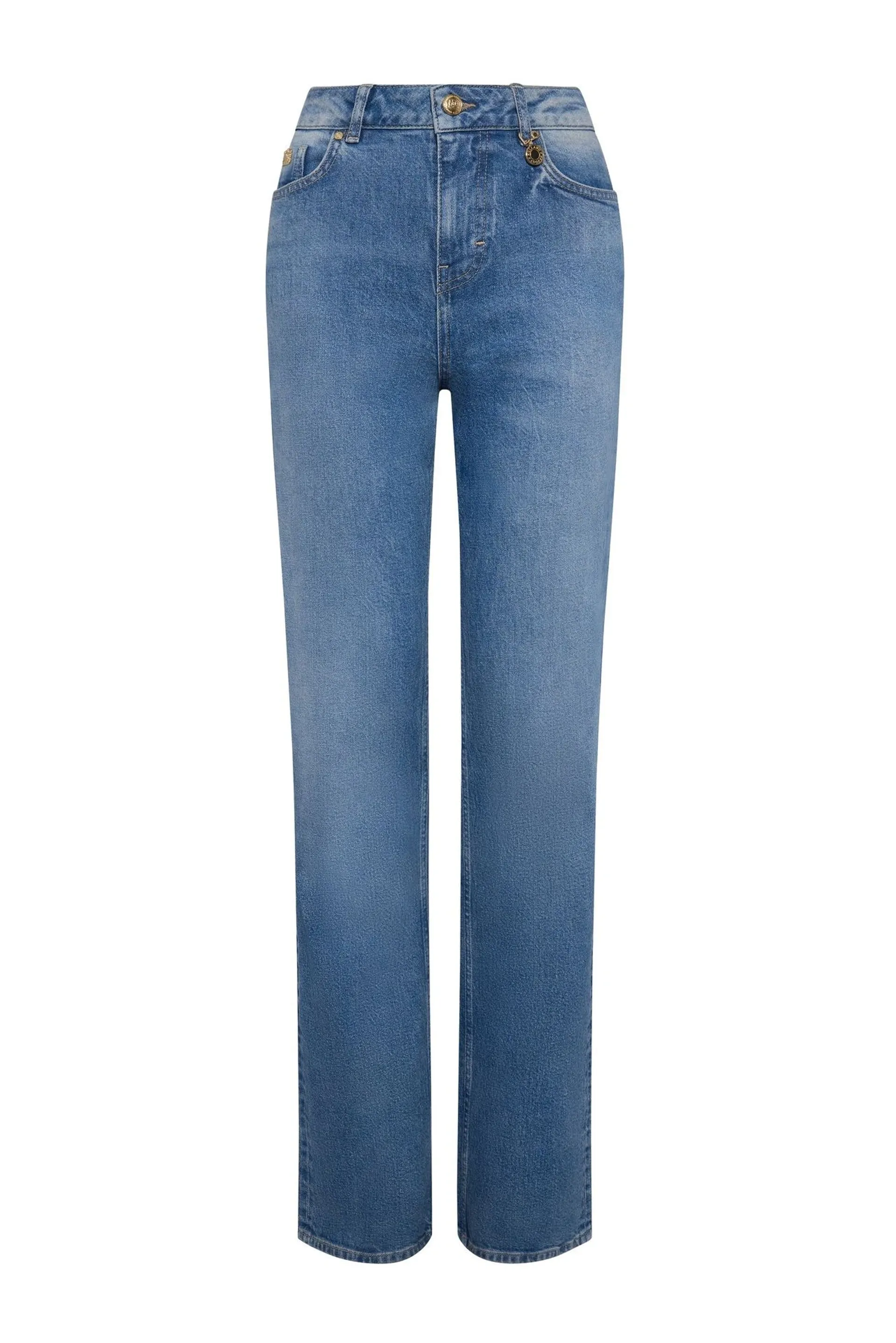 These jeans feature classic five-pocket styling and a single-shank waistband closure, ensuring a secure and comfortable fit. Adorned with signature gold hardware, they boast a high-rise design that accentuates them beautifully. Crafted for elegance, the jeans offer a long, straight leg with an outward seam for a retro-inspired silhouette. The leg width strikes the perfect balance - not too wide, not too slim - delivering a vintage feel with modern comfort. Whether you dress them up or down, these jeans are a versatile staple that exudes effortless style.