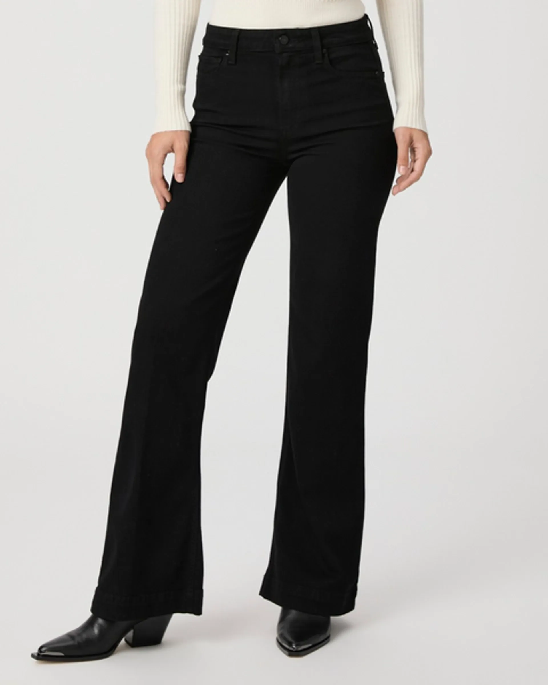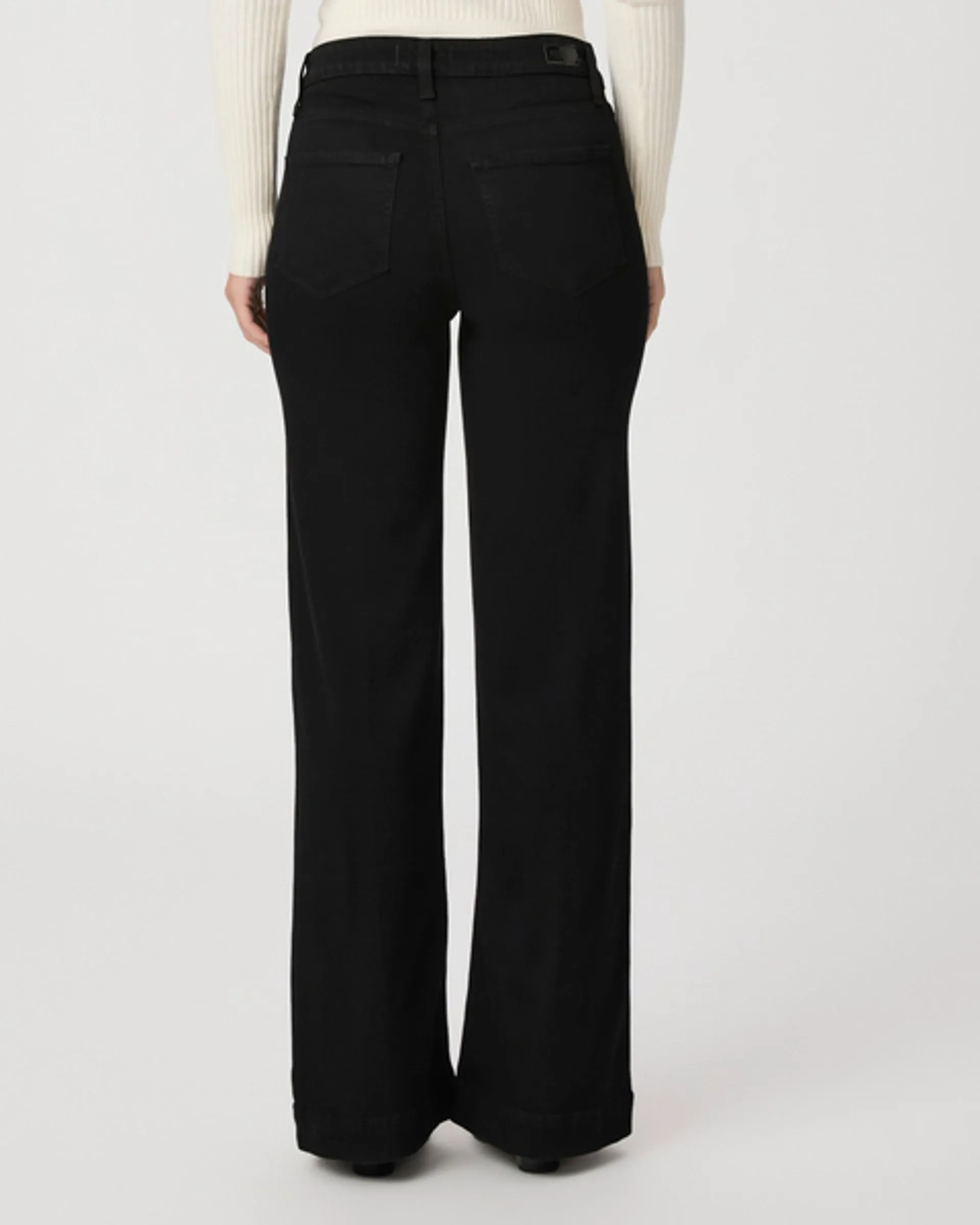This sleek, high rise, wide leg jean has a flattering bow leg and 32" inseam that pairs perfectly with flats and also works well with a heel for petite women. Made from their bestselling TRANSCEND denim in a rich black wash, this fashion-forward pair is luxuriously soft and incredibly comfortable with plenty of stretch and recovery to give it a flawless fit from morning to night.