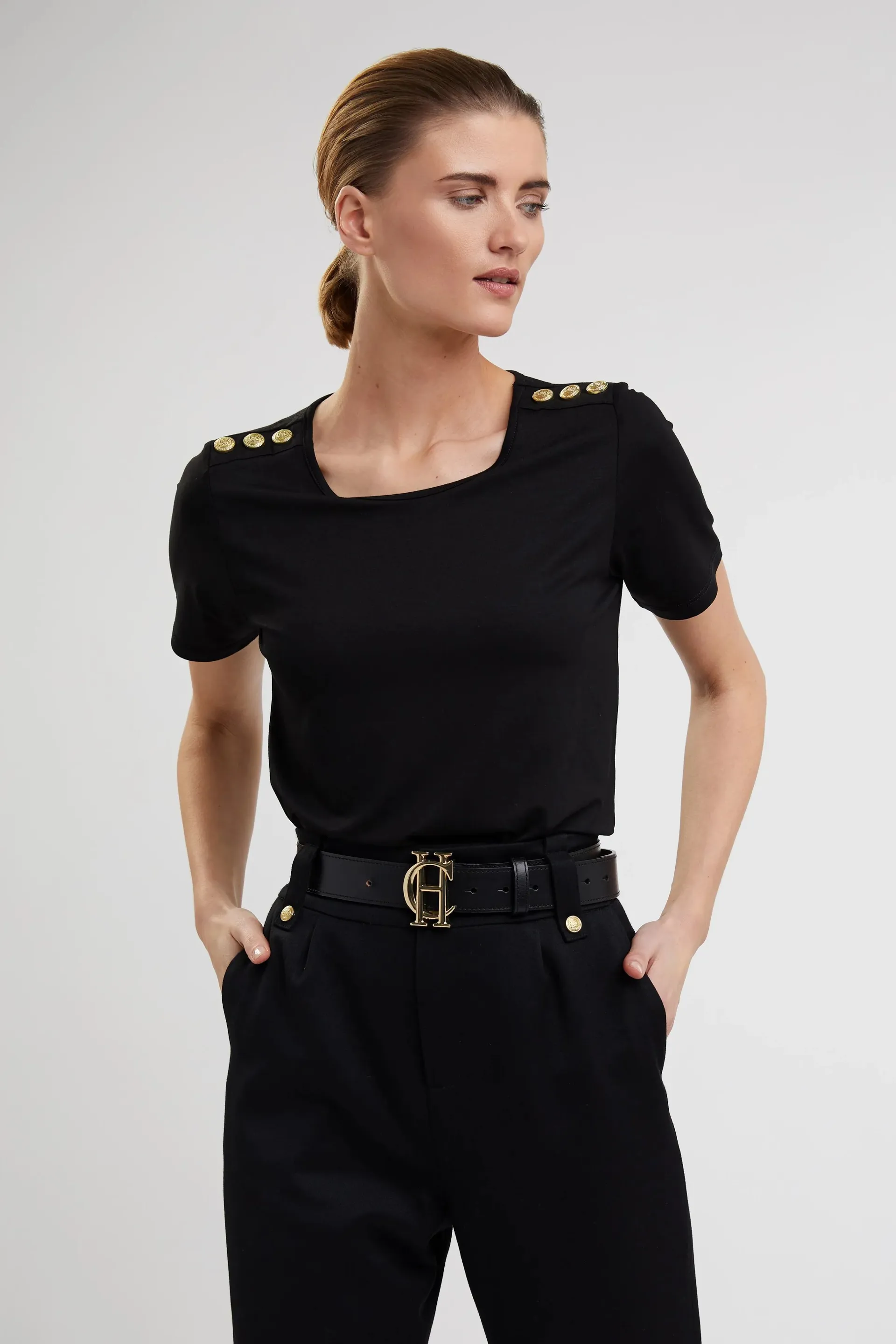 Holland Cooper Relaxed Fit Black Crew Neck T Shirt, made from the softest fabric for an extra flattering look and feel. Designed for a relaxed fit, but can still be tucked neatly into high-waisted pants. This tshirt is a midweight stretchy material, perfect for that comfortable fit, with the signature Holland Cooper branding on the shoulders. Wash 30 degrees.