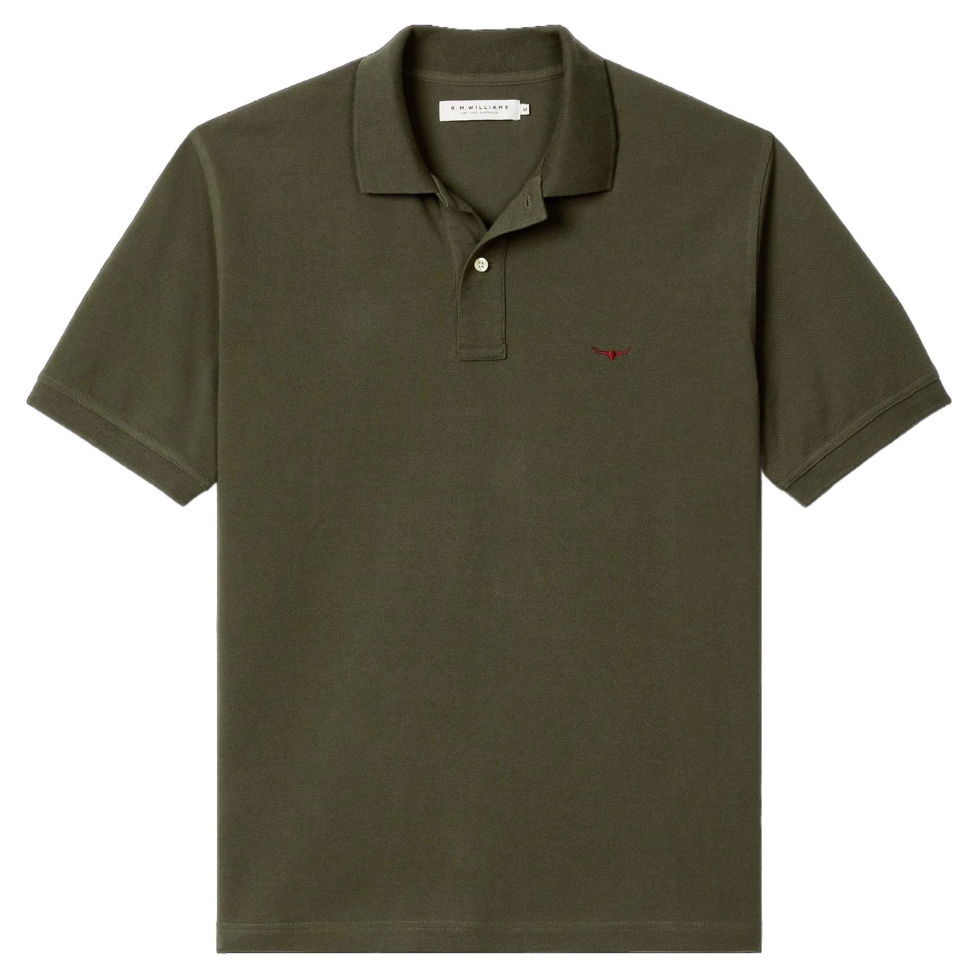 The R M Williams Rod Polo features a two-button placket with branded buttons and contrast Longhorn chest embroidery.