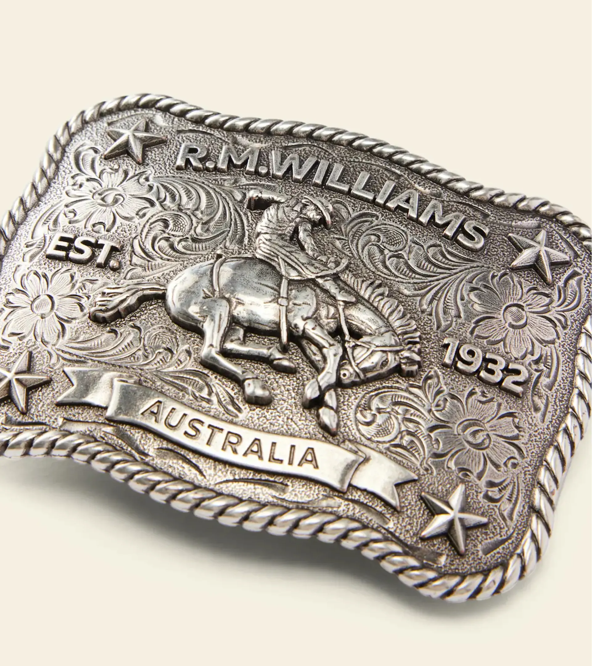 Question(s) answered about RM Williams Cloudbuster Trophy Buckle Antique Silver