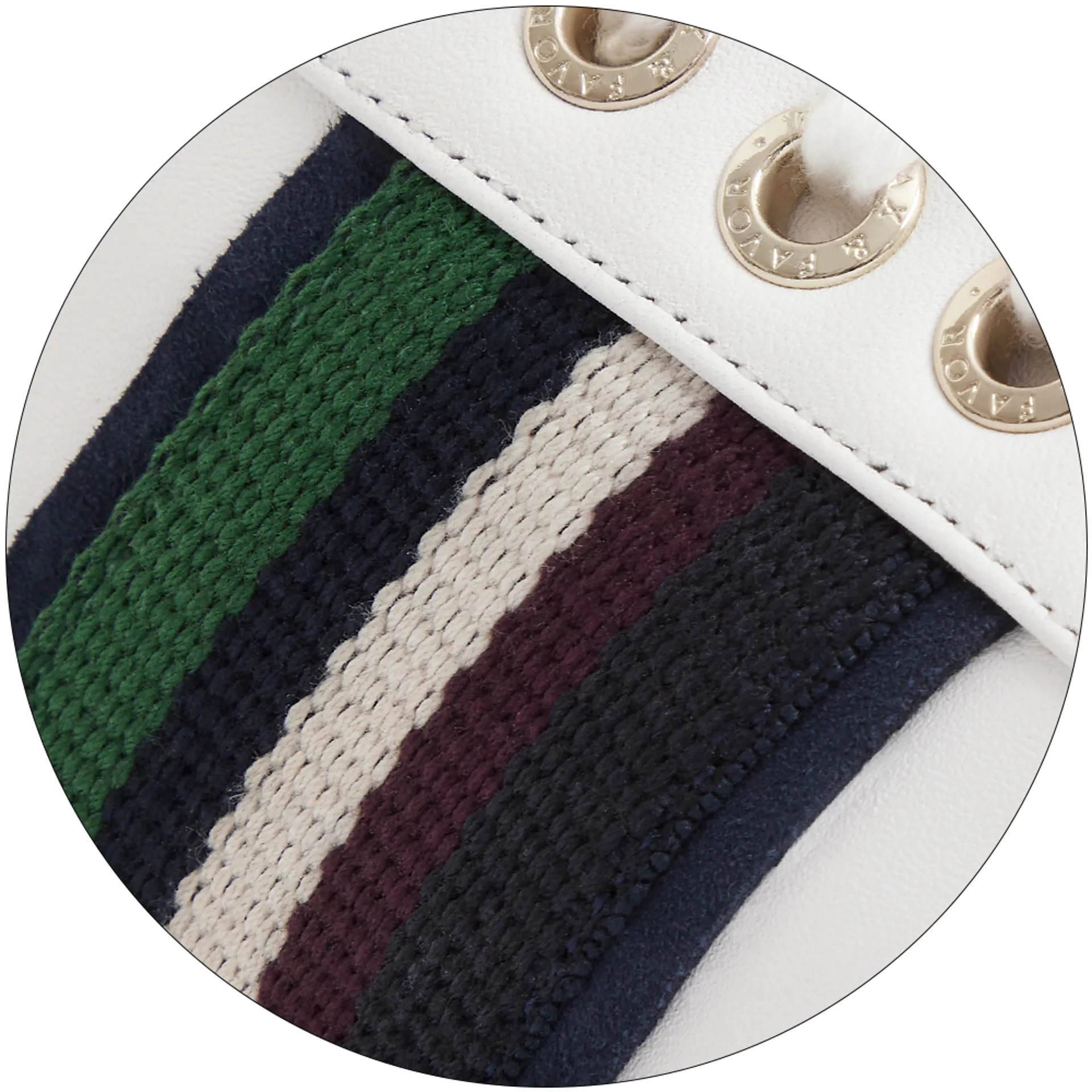 The Boston collection brings a pop of colour to summer days with plum, cream and forest green striped webbing that evokes sunny weekends out and about. Based on the iconic Alexandra, the Boston Trainer is a laidback choice for slidling through summer. Pair with a floaty maxi dress for festivals or shorts for a beach or boardwalk. Pair with the Boston Bag!