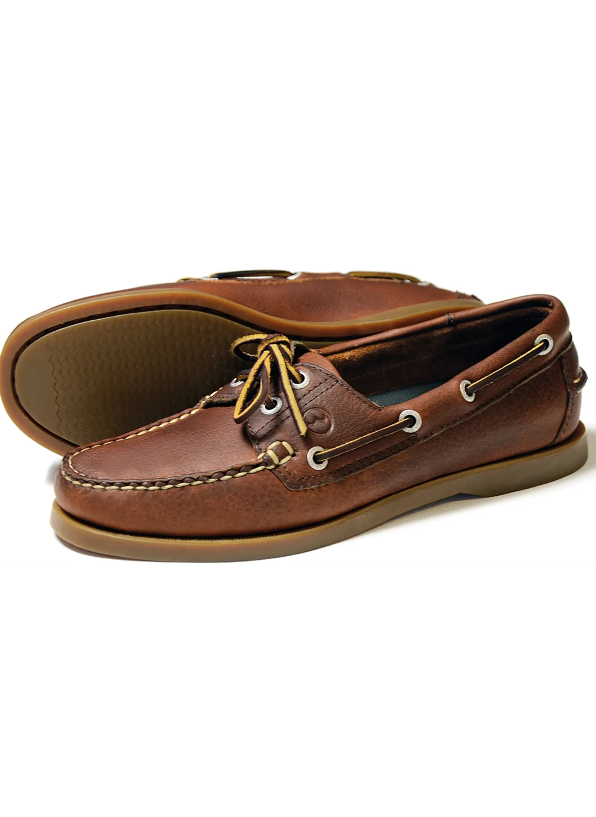 Orca Bay Creek Deck Shoes are the most authentic classic boat style shoe. The Creek, features a non-slip and non-marking hard wearing sole, rawhide laces, salt resistant eyelets and leathers, shock absorbing heel cups, and double stitching with a full moccasin construction. Extremely popular deck shoes. The Creek deck shoes are darker than the sand leather and the smooth darker saddle leather.