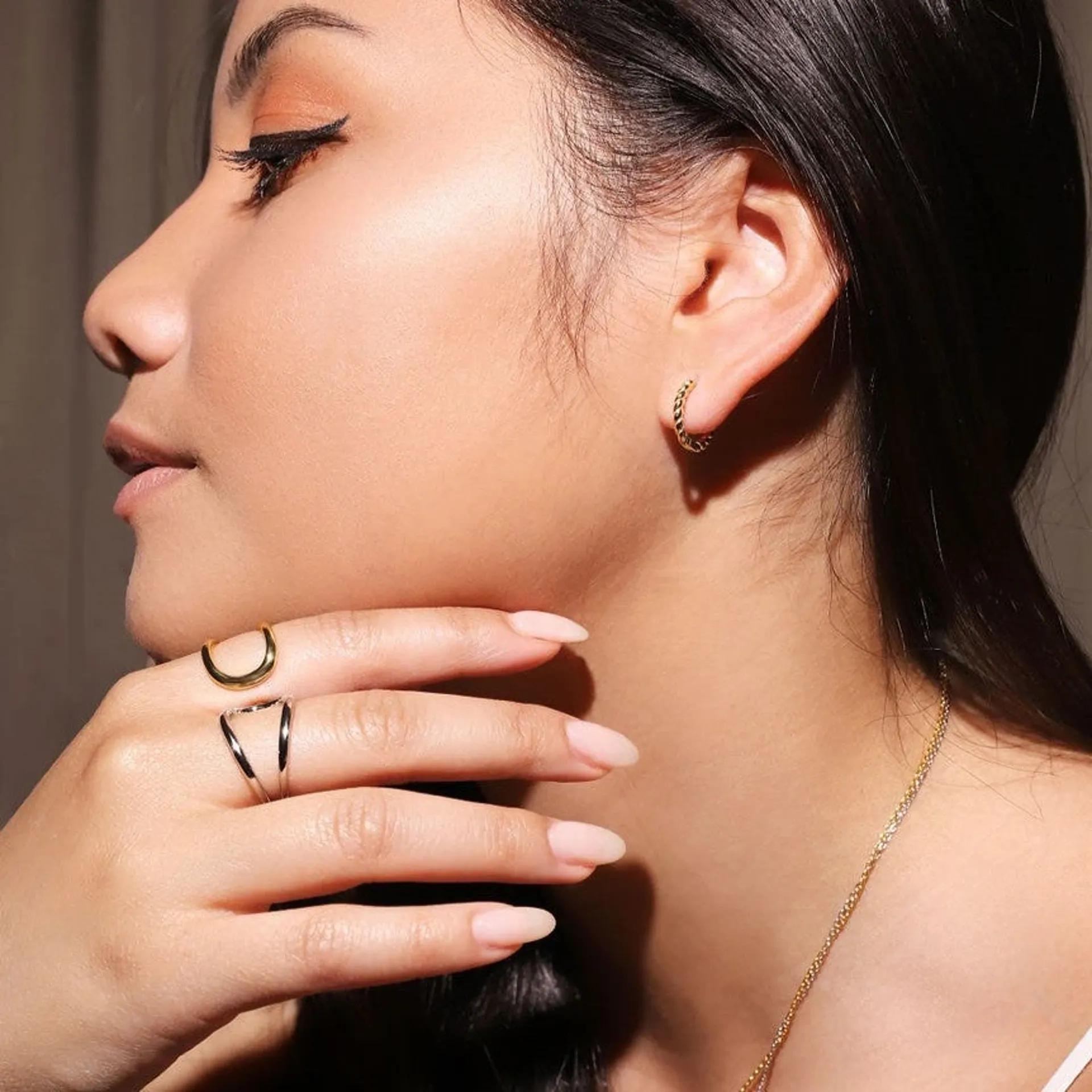 Available in an 18ct gold plated variant, the Twist Hoop Earrings will be your go-to ear hoop. These small statements will hold their own alone or sit alongside any necklace.
