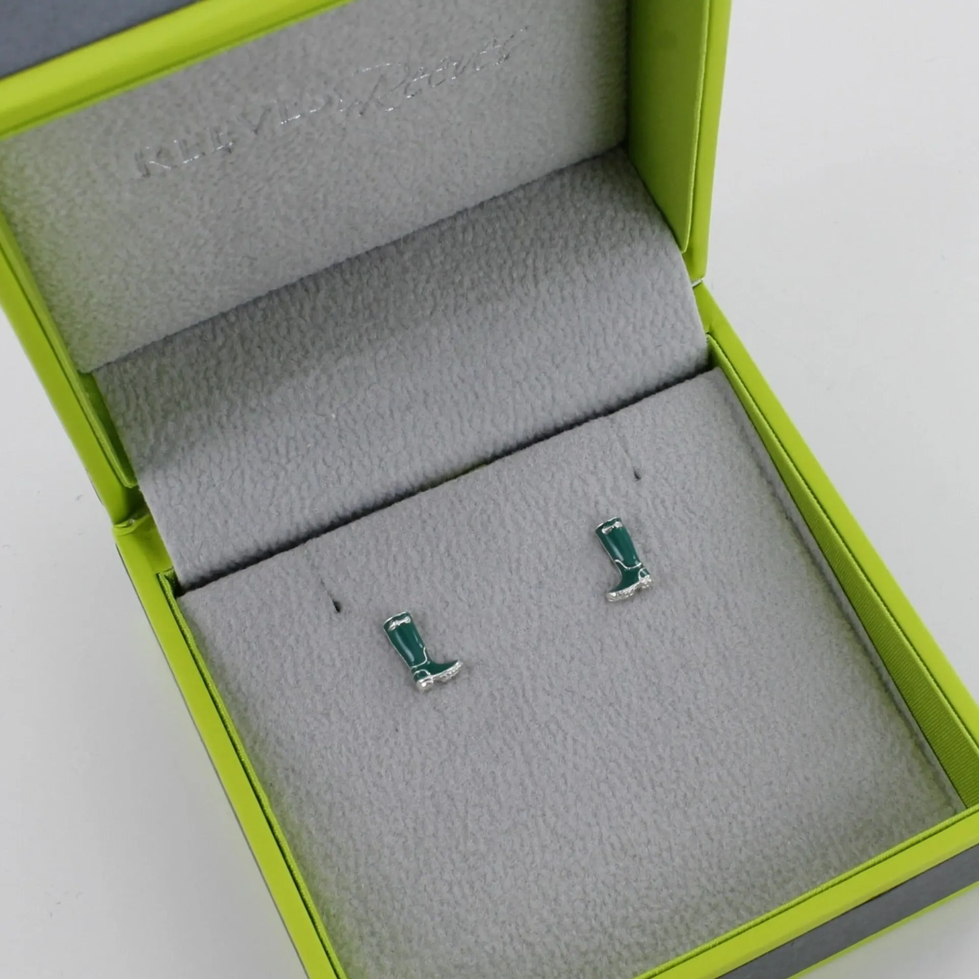 These Sterling Silver and Enamel Welly Studs feature an iconic British design with bright green enamel and exquisite detailing on the sole of the boot.