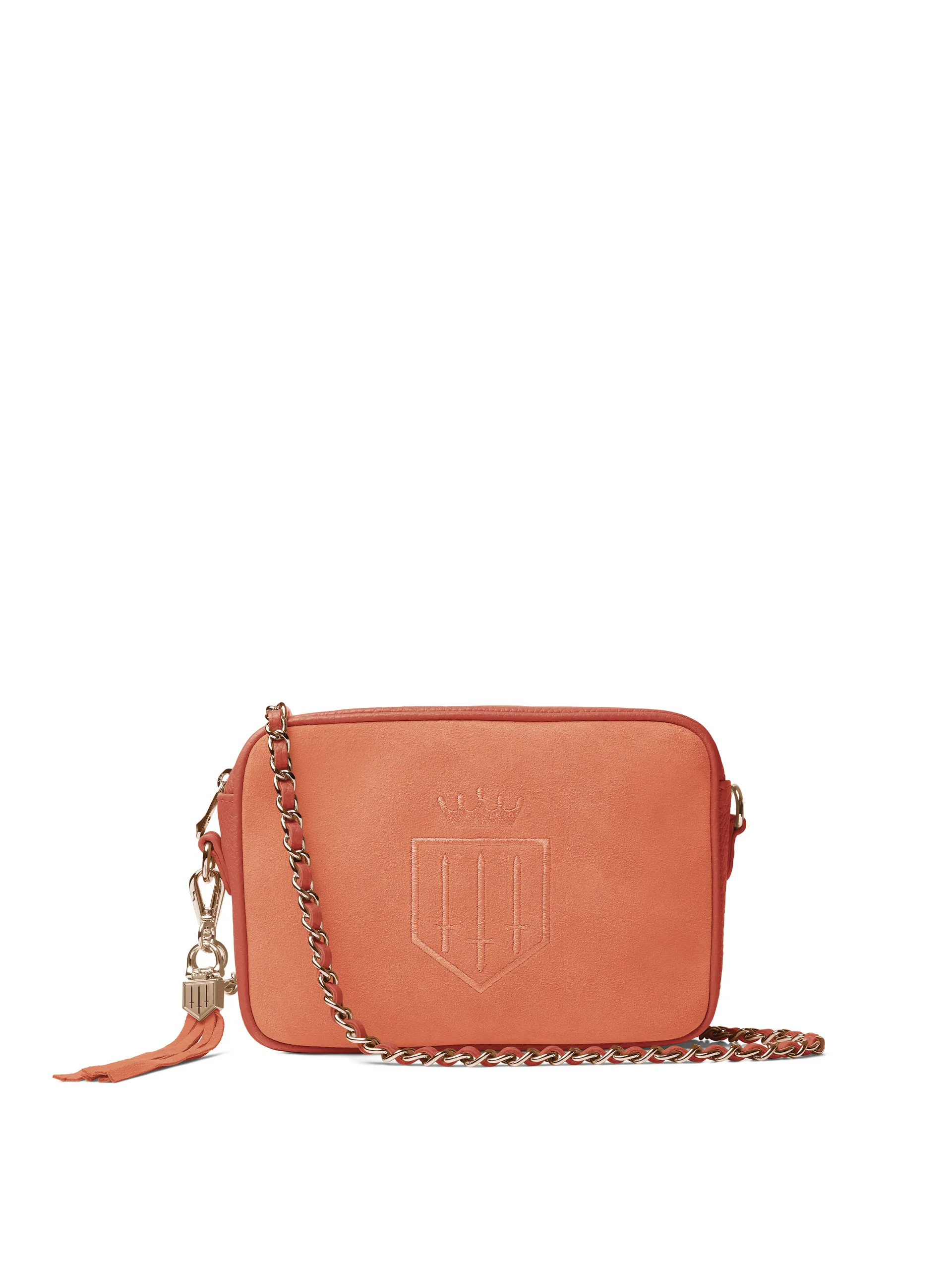 The Finsbury Crossbody Bag, is compact yet spacious. Crafted in premium suede and leather, enhanced by the tonal shield embroidery and a detachable suede tassel. The Finsbury is a stylish option for when you’re on the go. Finished with a detachable gold chain and leather strap, can be worn over the shoulder or crossbody. Pair with your favourite jacket, Sennowe belt and Henley loafers for the ultimate weekend look.